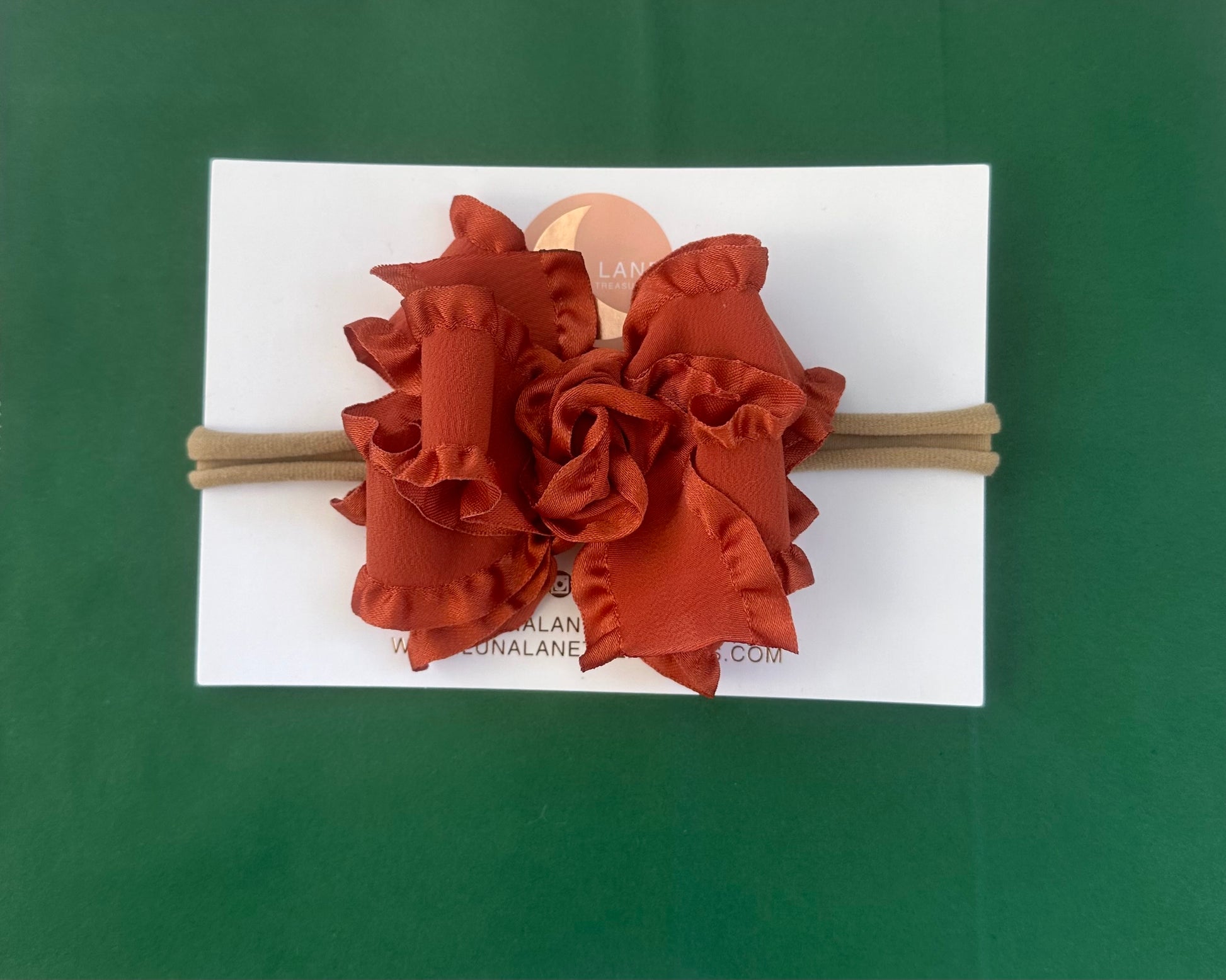 Introducing the Rust Classic Medium Ruffle - perfect for those who love a bit of flair! Each bow measures approximately 4 inches wide and is made of layered Ruffle ribbon for a playful touch. Attached to a stretchy nylon headband, this accessory fits most infants.
