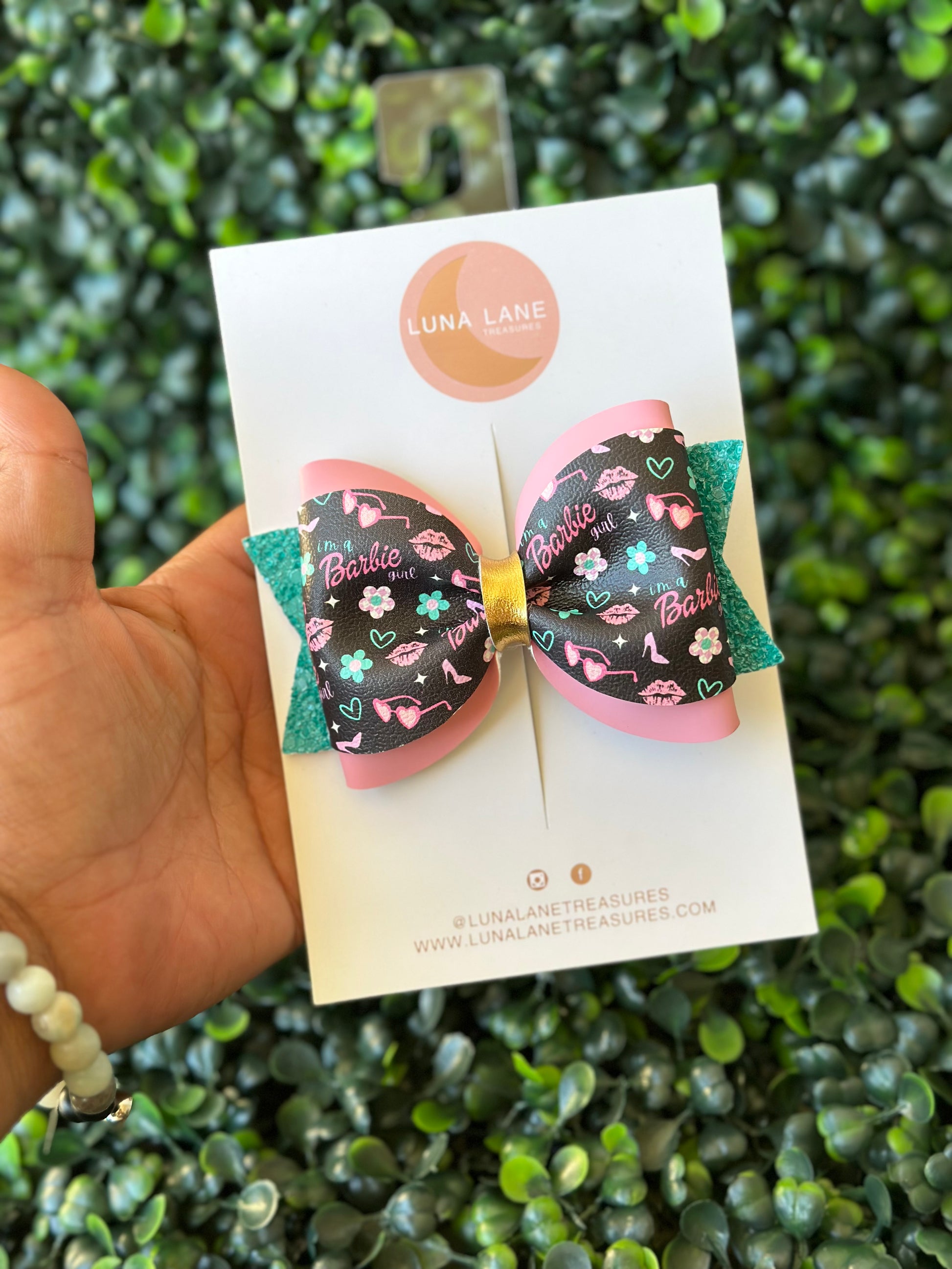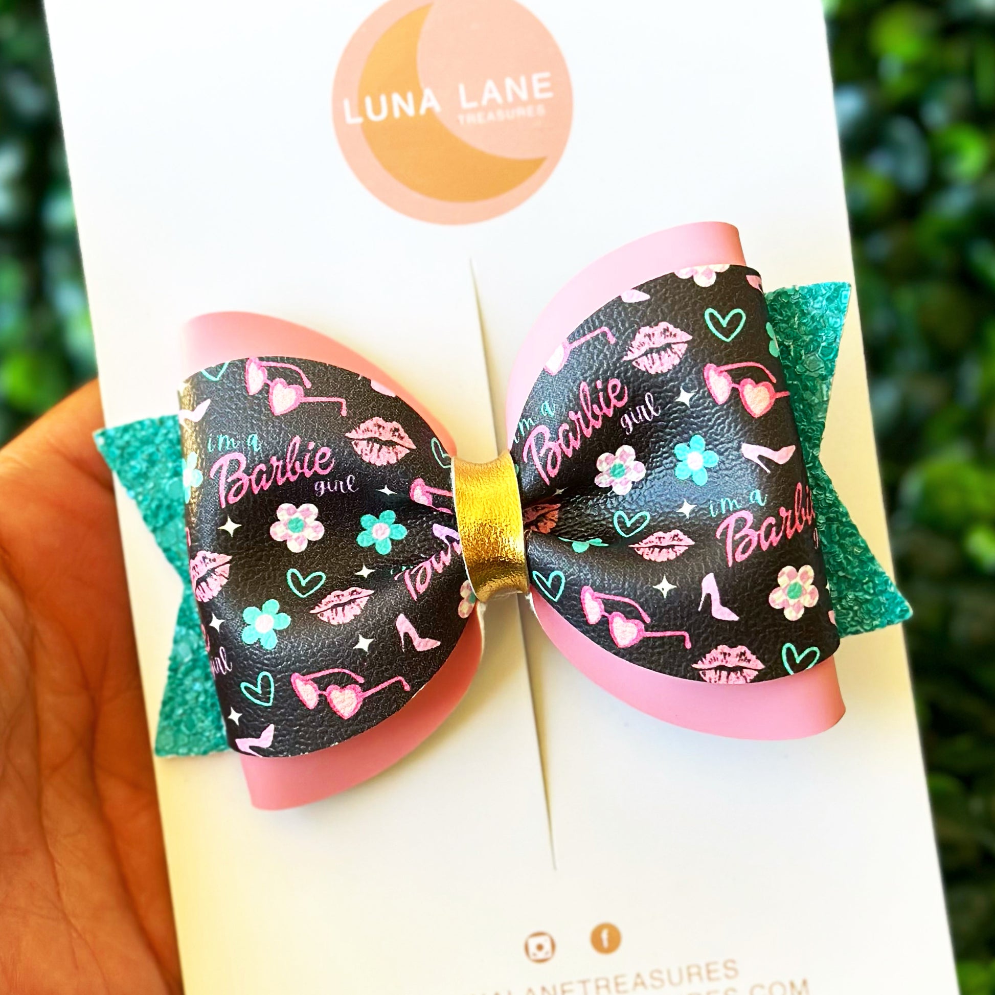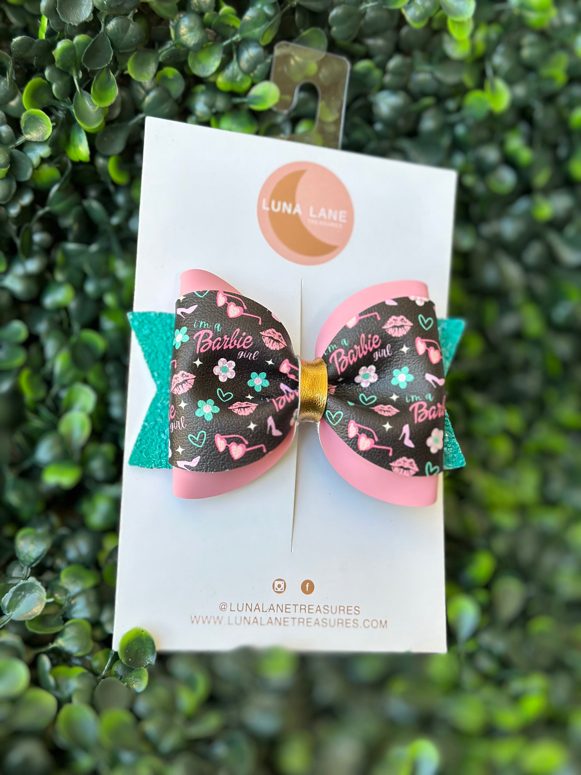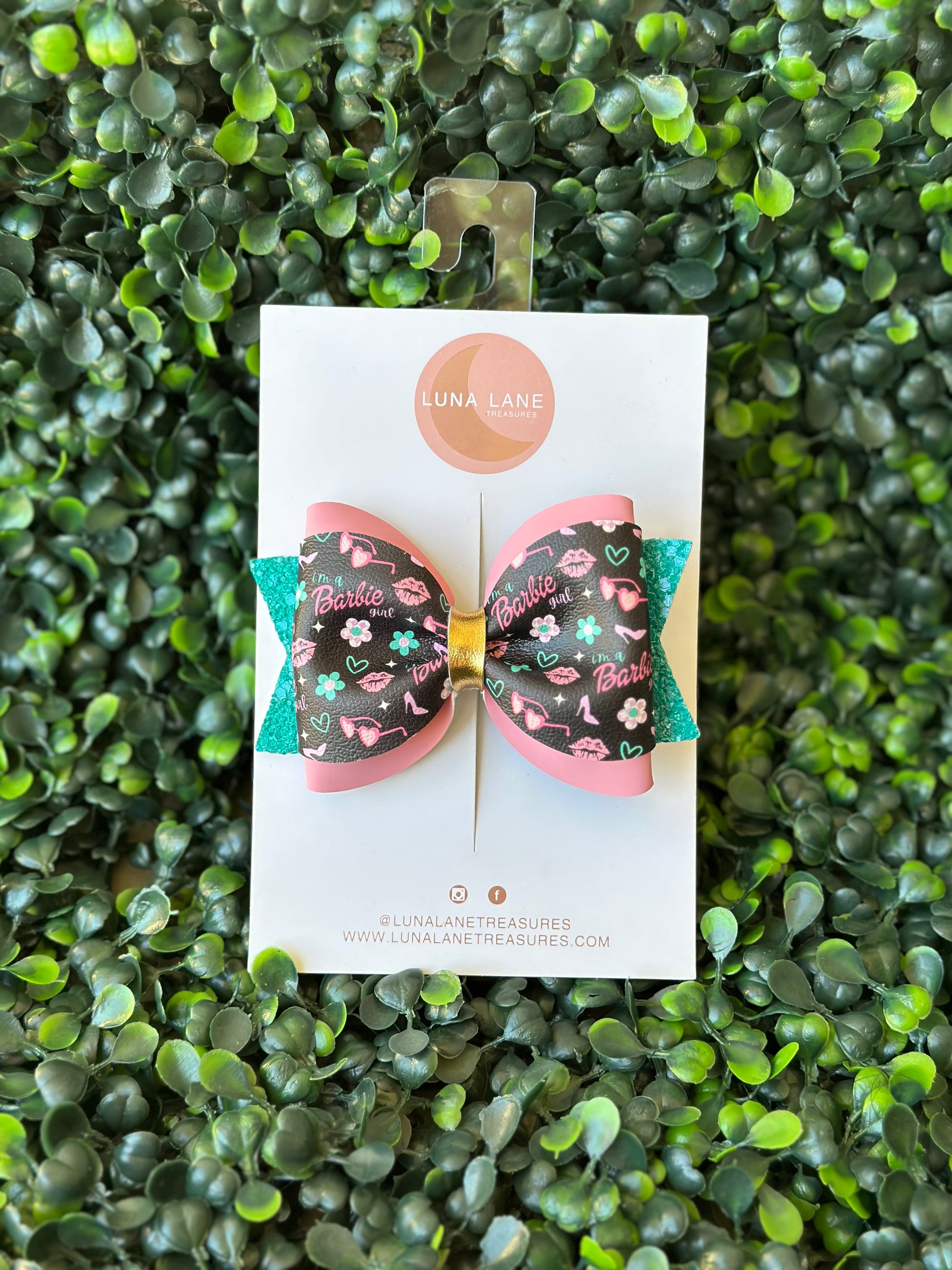 Añade un toque de alegría a cualquier look con el lazo para el pelo Lucille. Este lazo de cuero vegano de 3,5 pulgadas, con su estampado inspirado en un traje de baño, está sujeto a una pinza de cocodrilo alineada con terciopelo para un ajuste seguro y cómodo. ¡Perfecto para niñas de todas las edades!