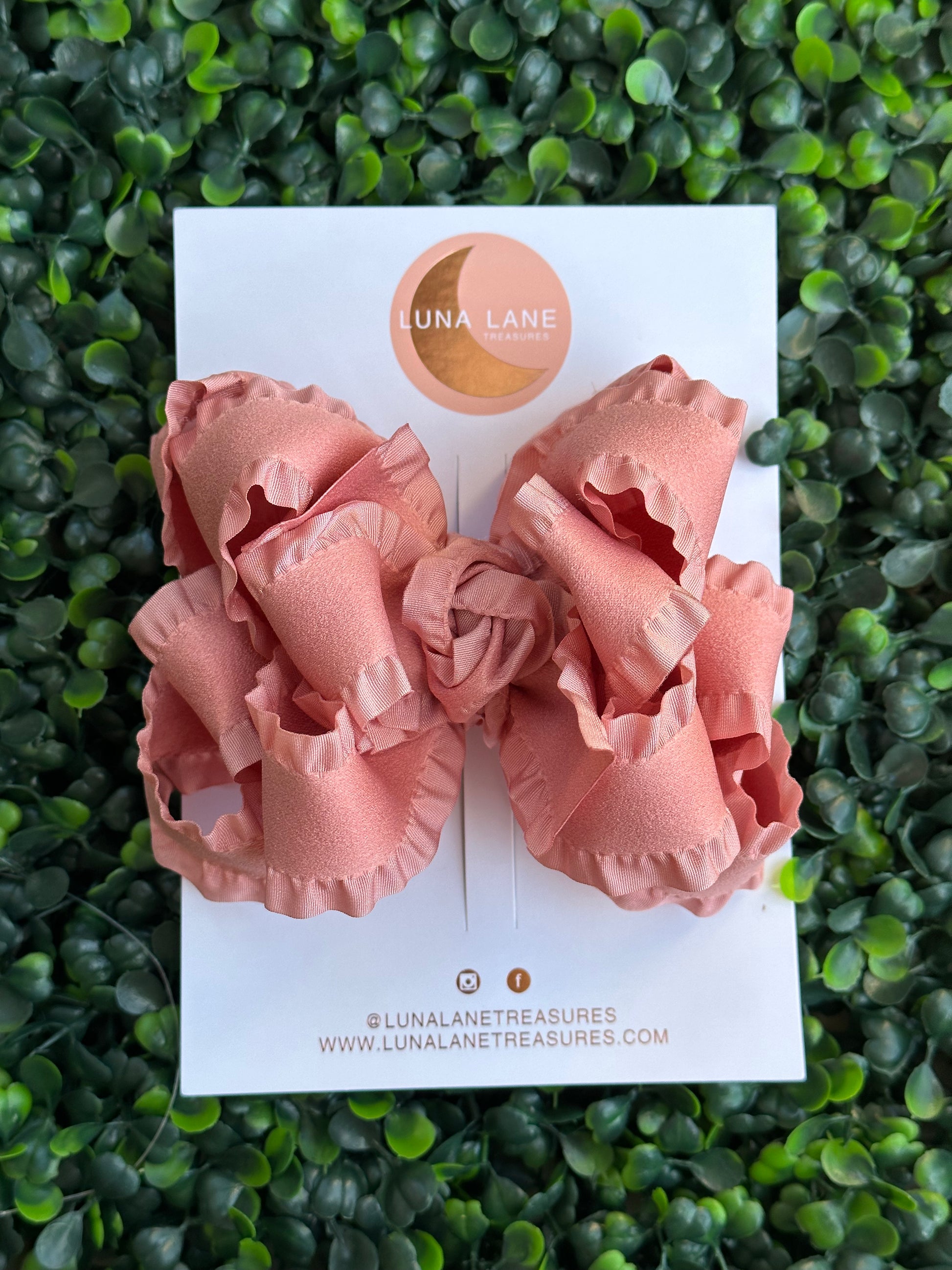 Añade el toque perfecto a tu peinado con el Ruffle Bow. Este lazo, que mide 5,5 pulgadas de ancho, tiene capas de cinta con doble volante y se sujeta de forma segura a una pinza de cocodrilo alineada o a una diadema de nailon. Con su aspecto clásico y su fijación segura, puede estar seguro de que su arco permanecerá en su sitio.