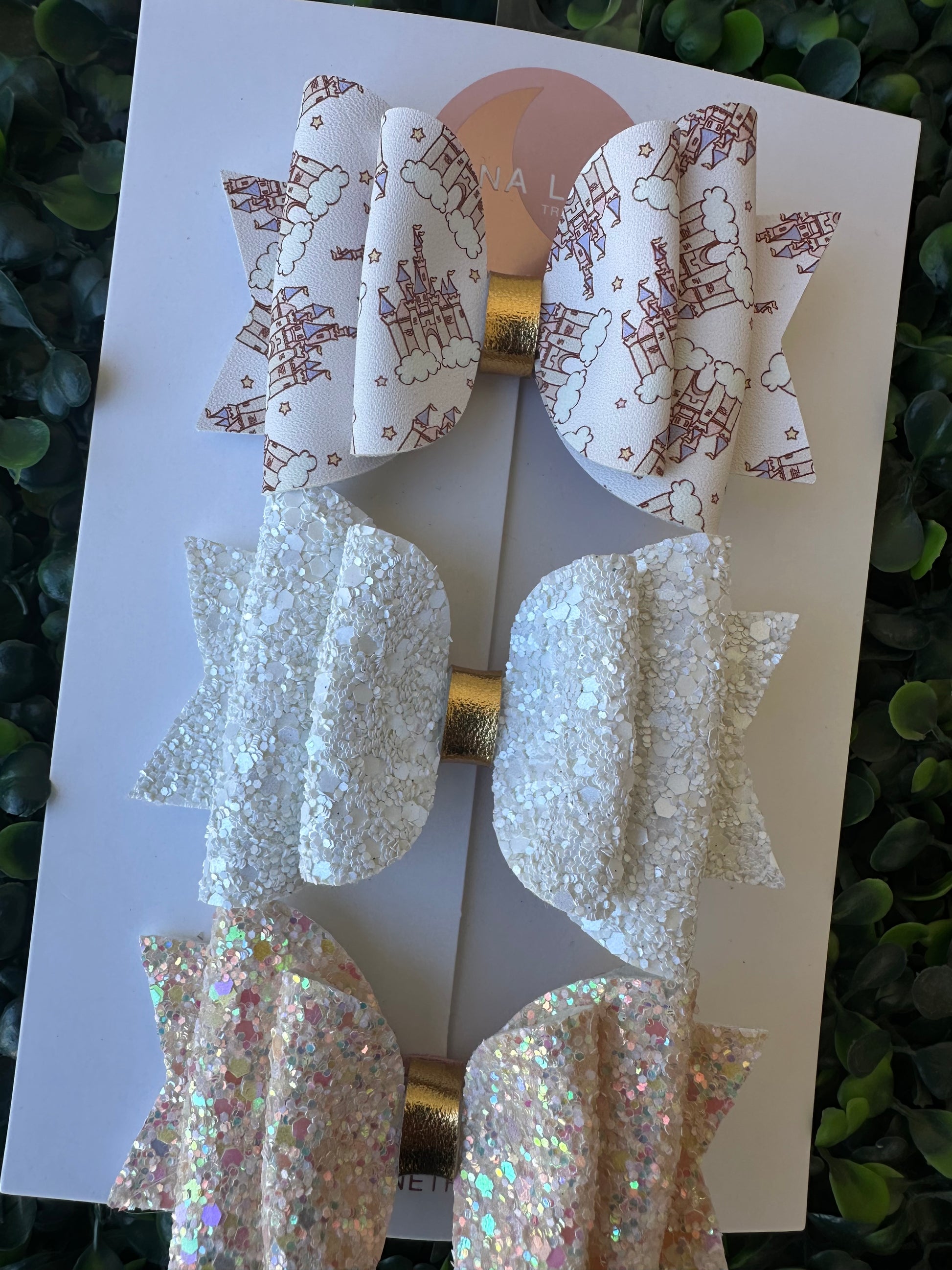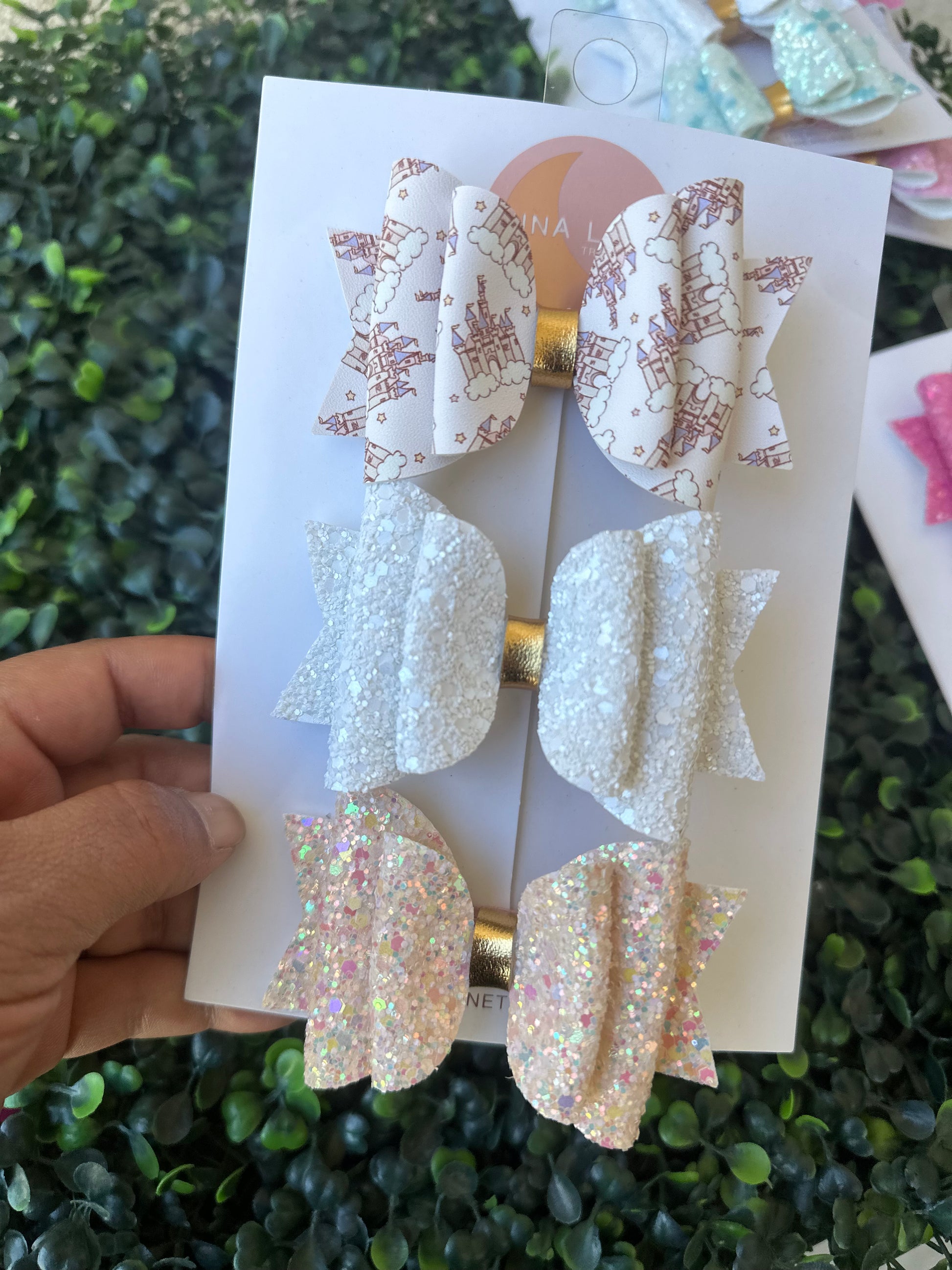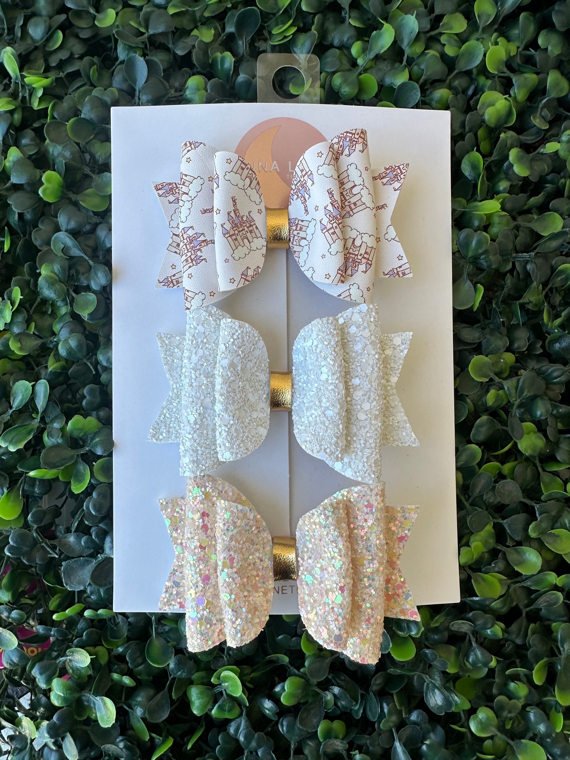 Enhance your style and support with our enchanted 3 Bow Set. This set features a 3.5 inch wide bow with beige and white glitter, as well as a printed bow, both attached to secure alligator clips. Add a playful touch to your outfit with ease.