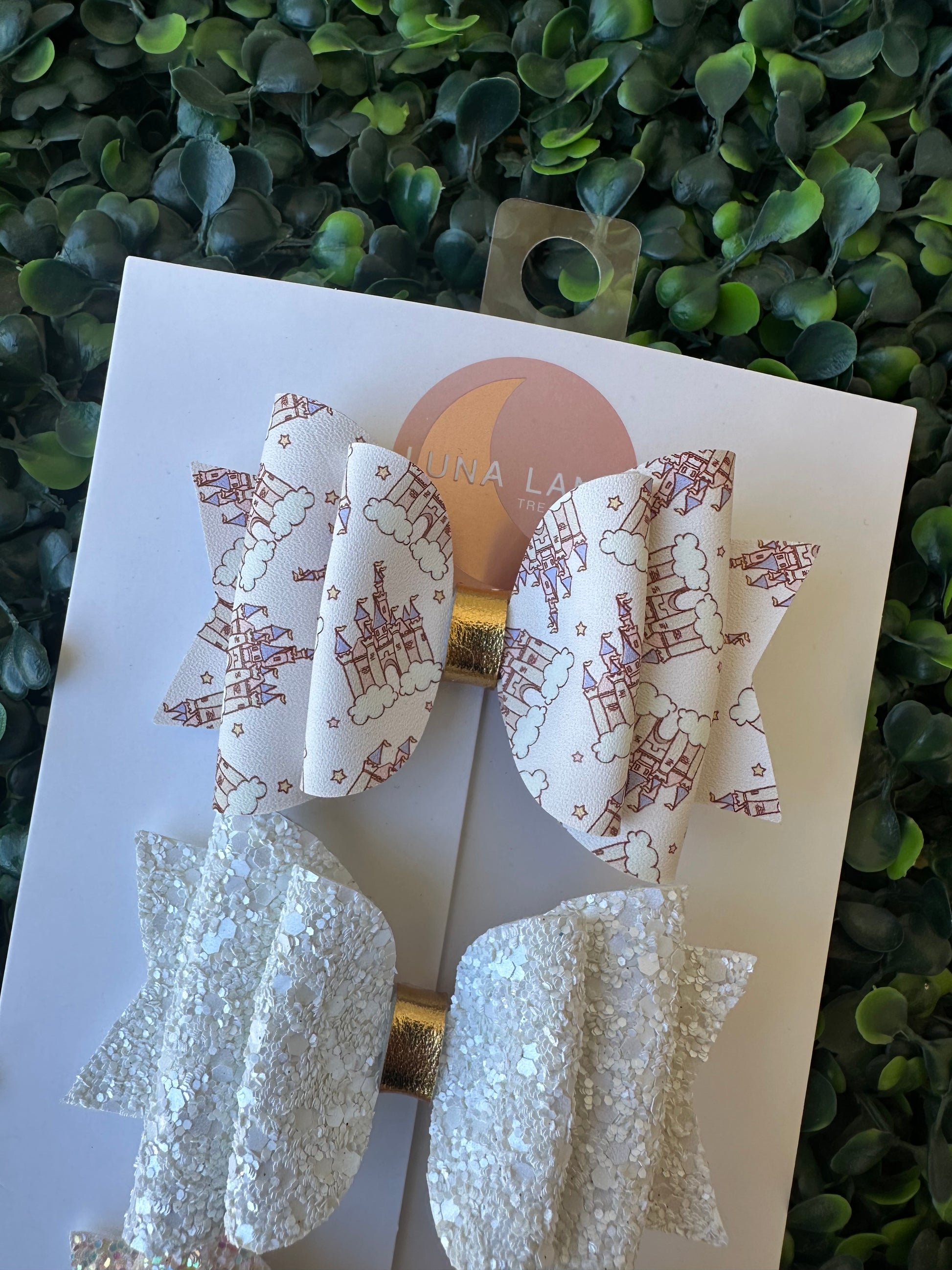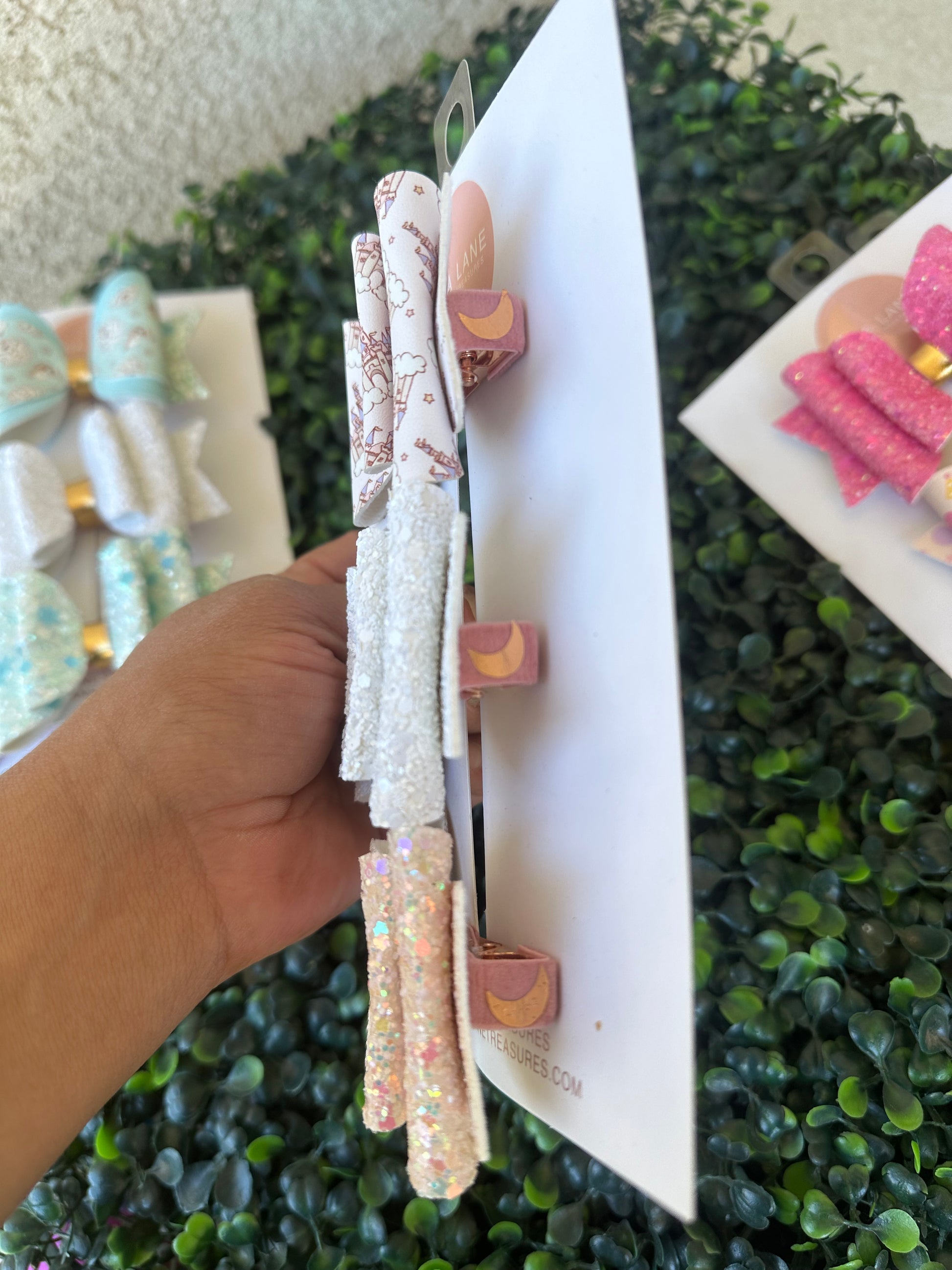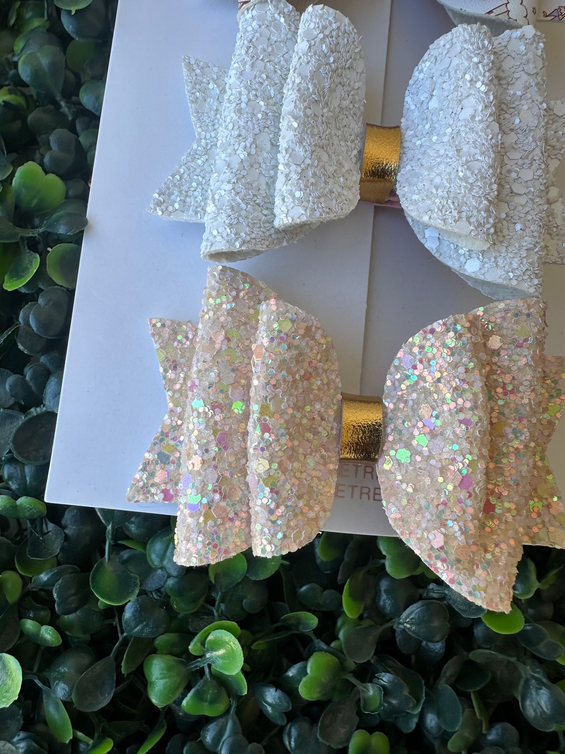 Enhance your style and support with our enchanted 3 Bow Set. This set features a 3.5 inch wide bow with beige and white glitter, as well as a printed bow, both attached to secure alligator clips. Add a playful touch to your outfit with ease.