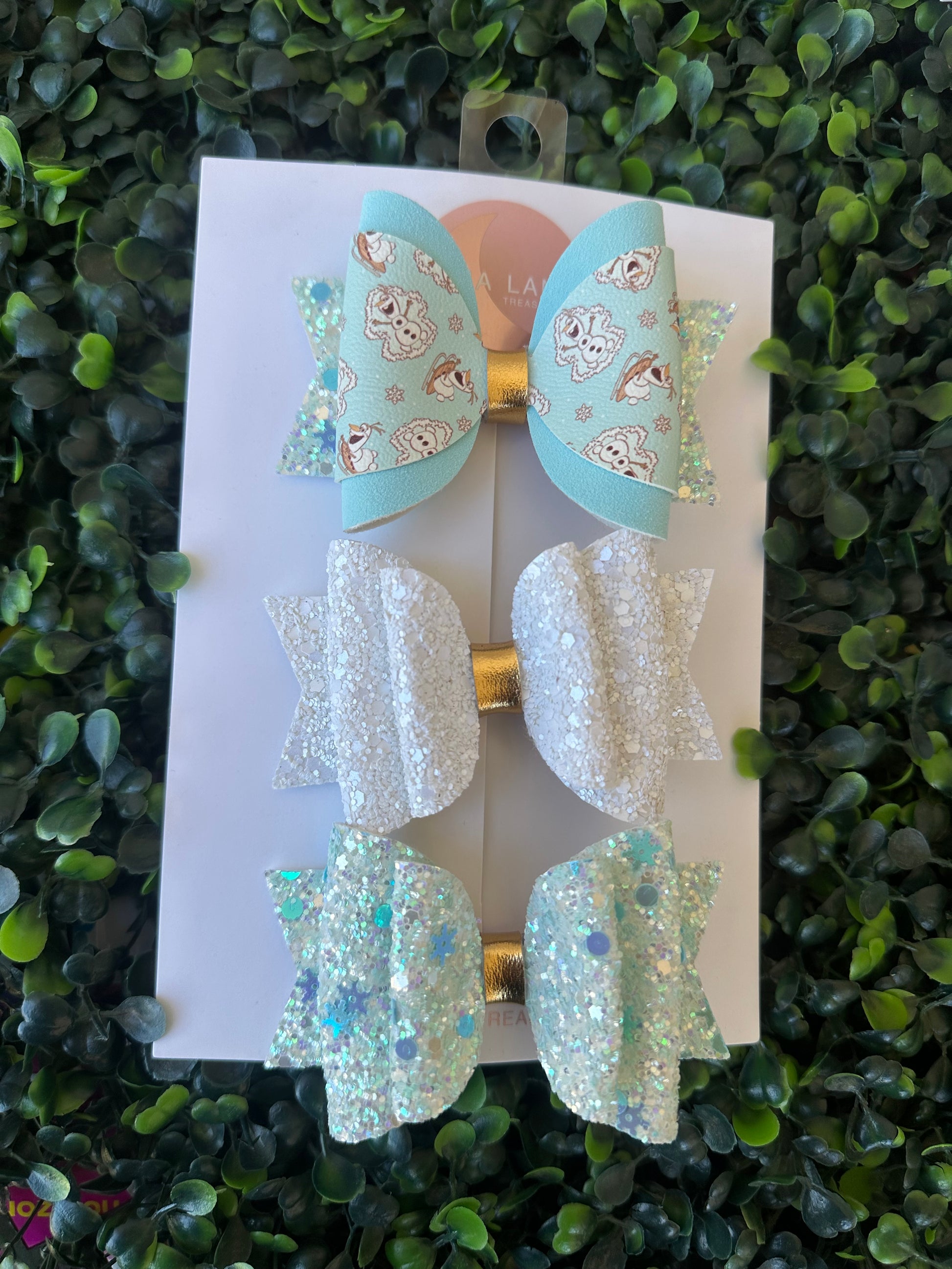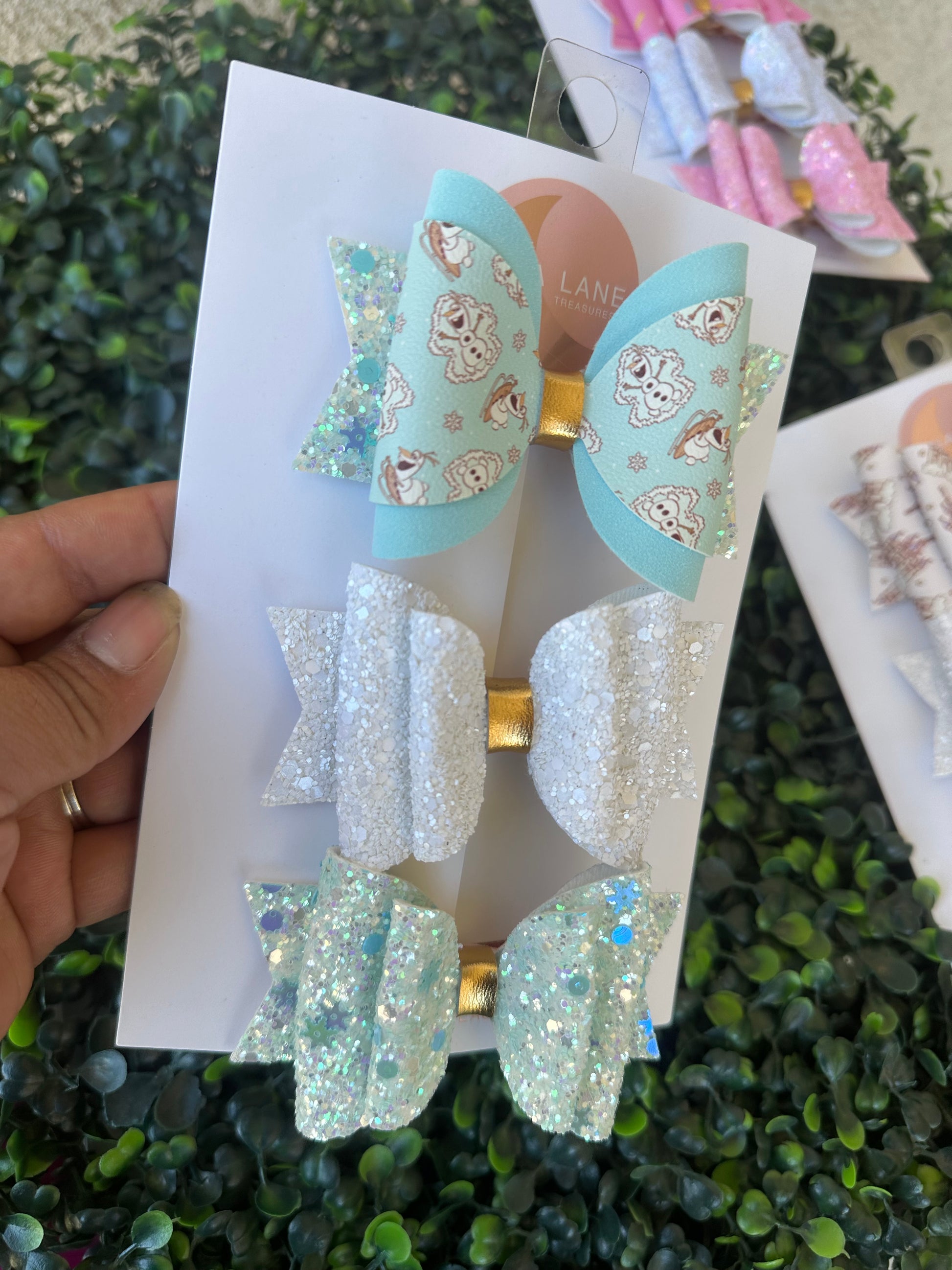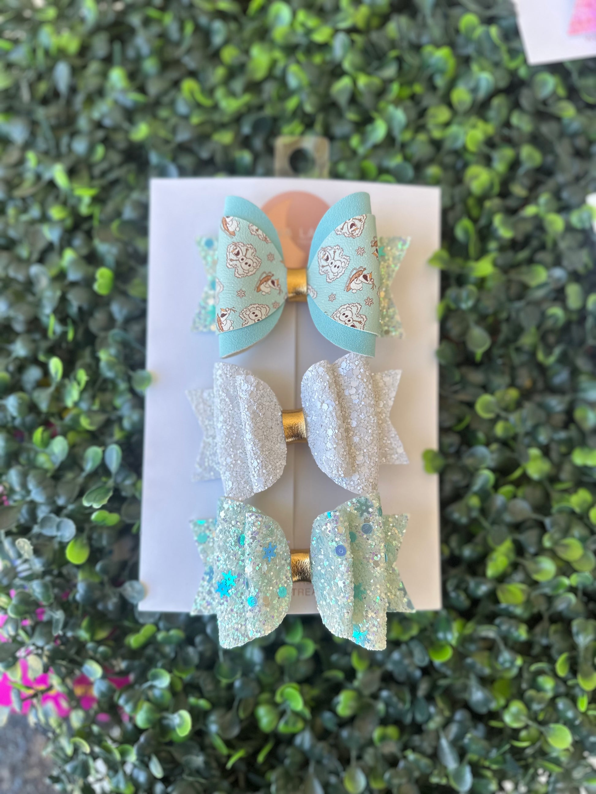 Enhance your style and support with our enchanted 3 Bow Set. This set features a 3.5 inch wide bow with beige and white glitter, as well as a printed bow, both attached to secure alligator clips. Add a playful touch to your outfit with ease.