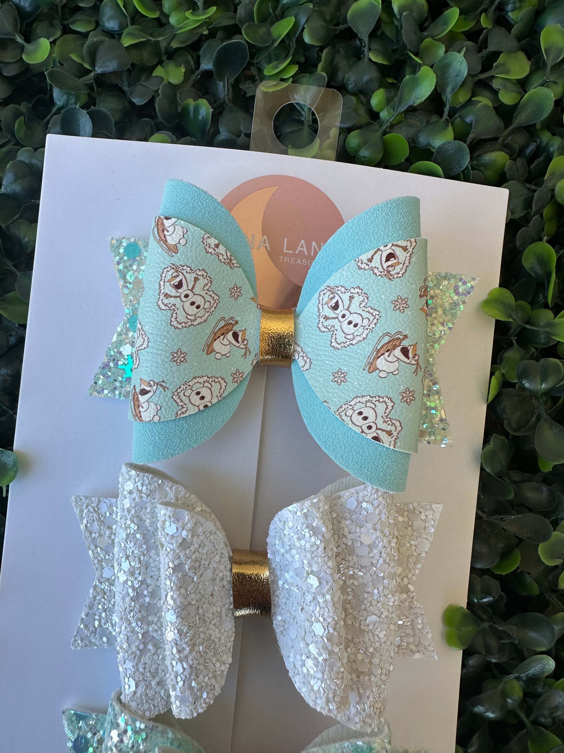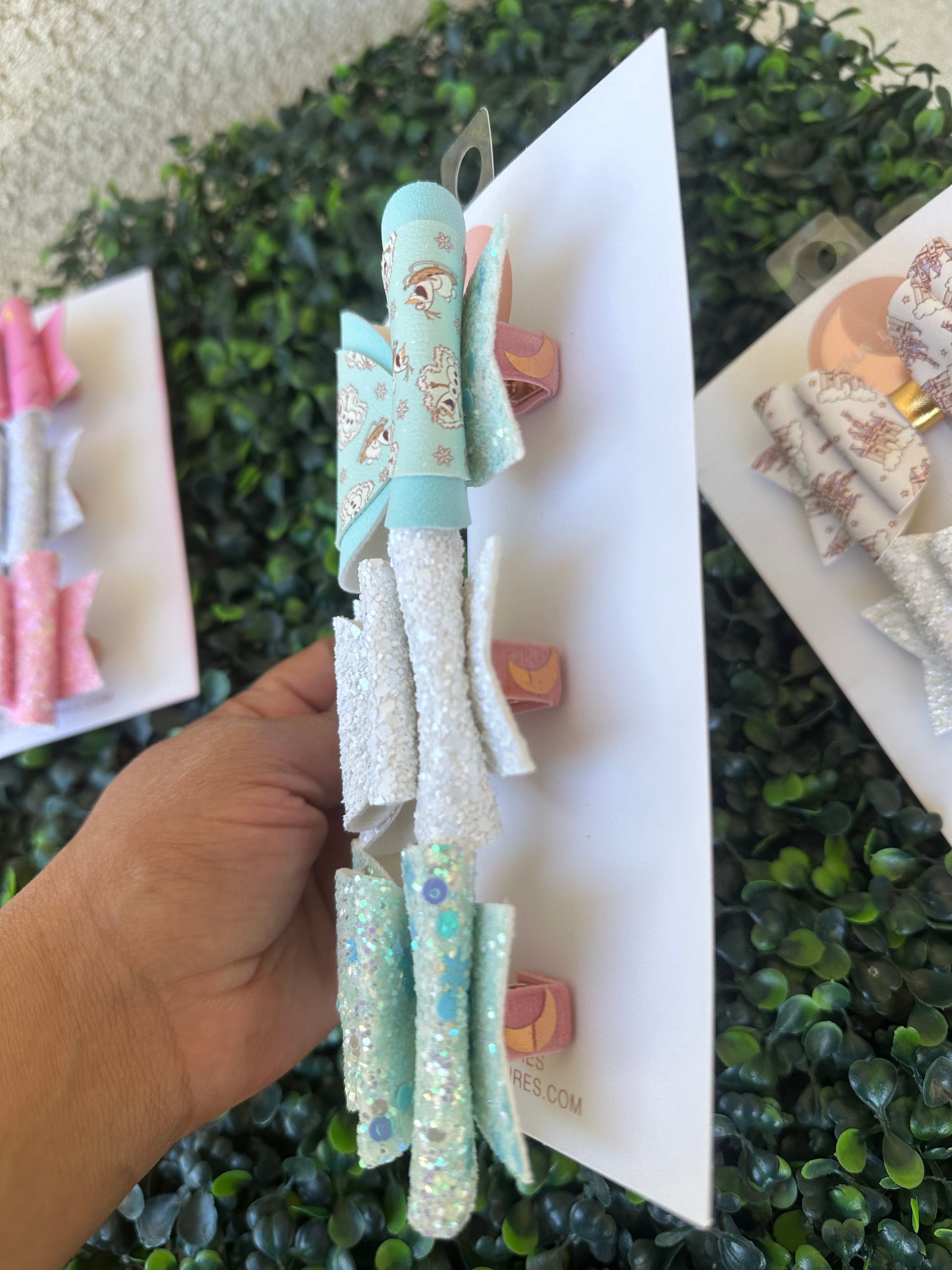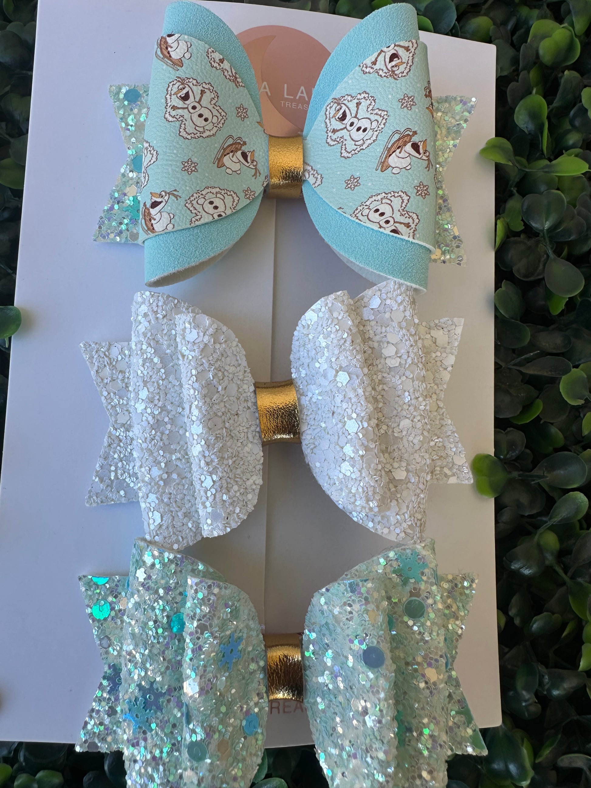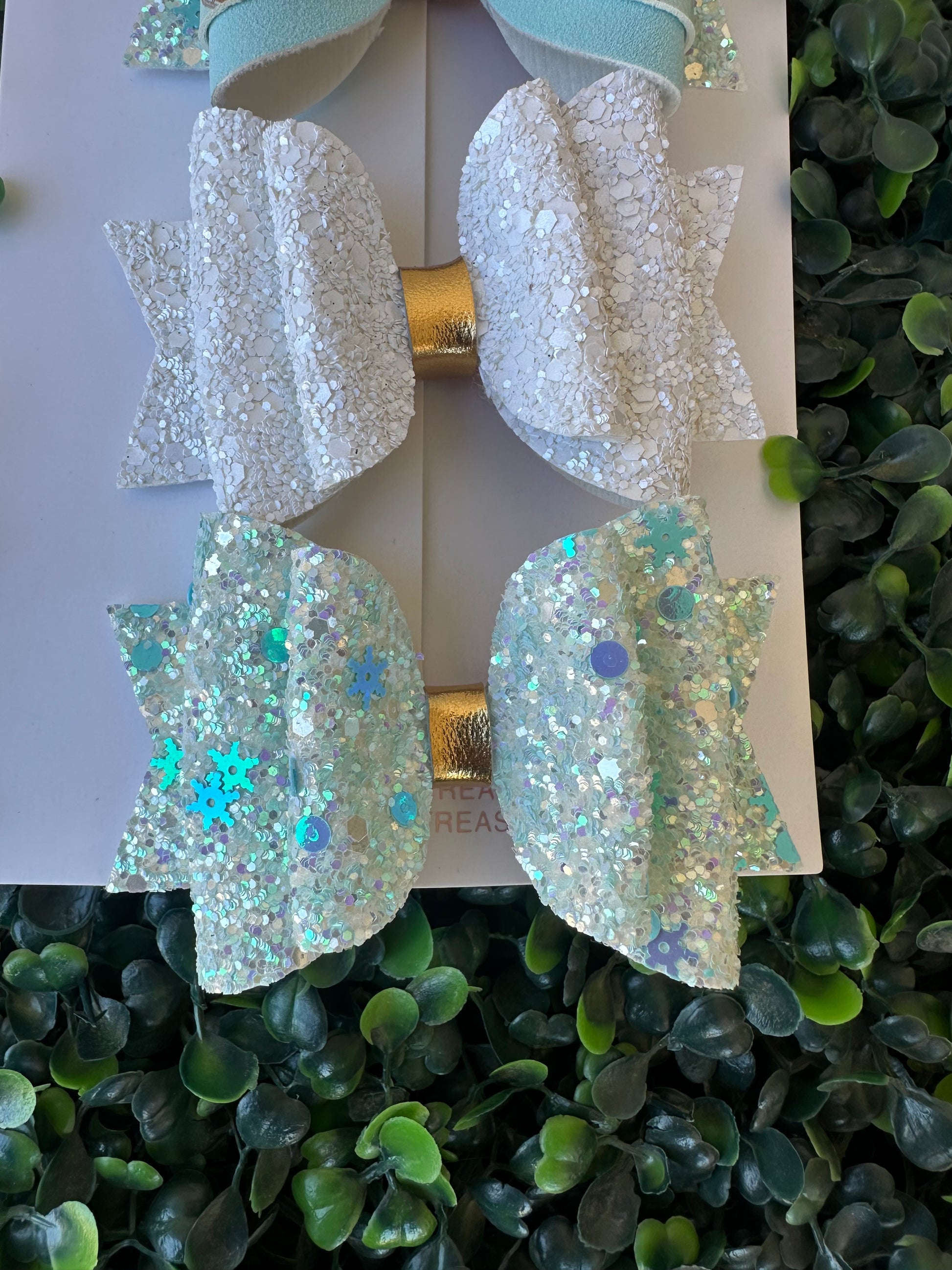 Enhance your style and support with our enchanted 3 Bow Set. This set features a 3.5 inch wide bow with beige and white glitter, as well as a printed bow, both attached to secure alligator clips. Add a playful touch to your outfit with ease.