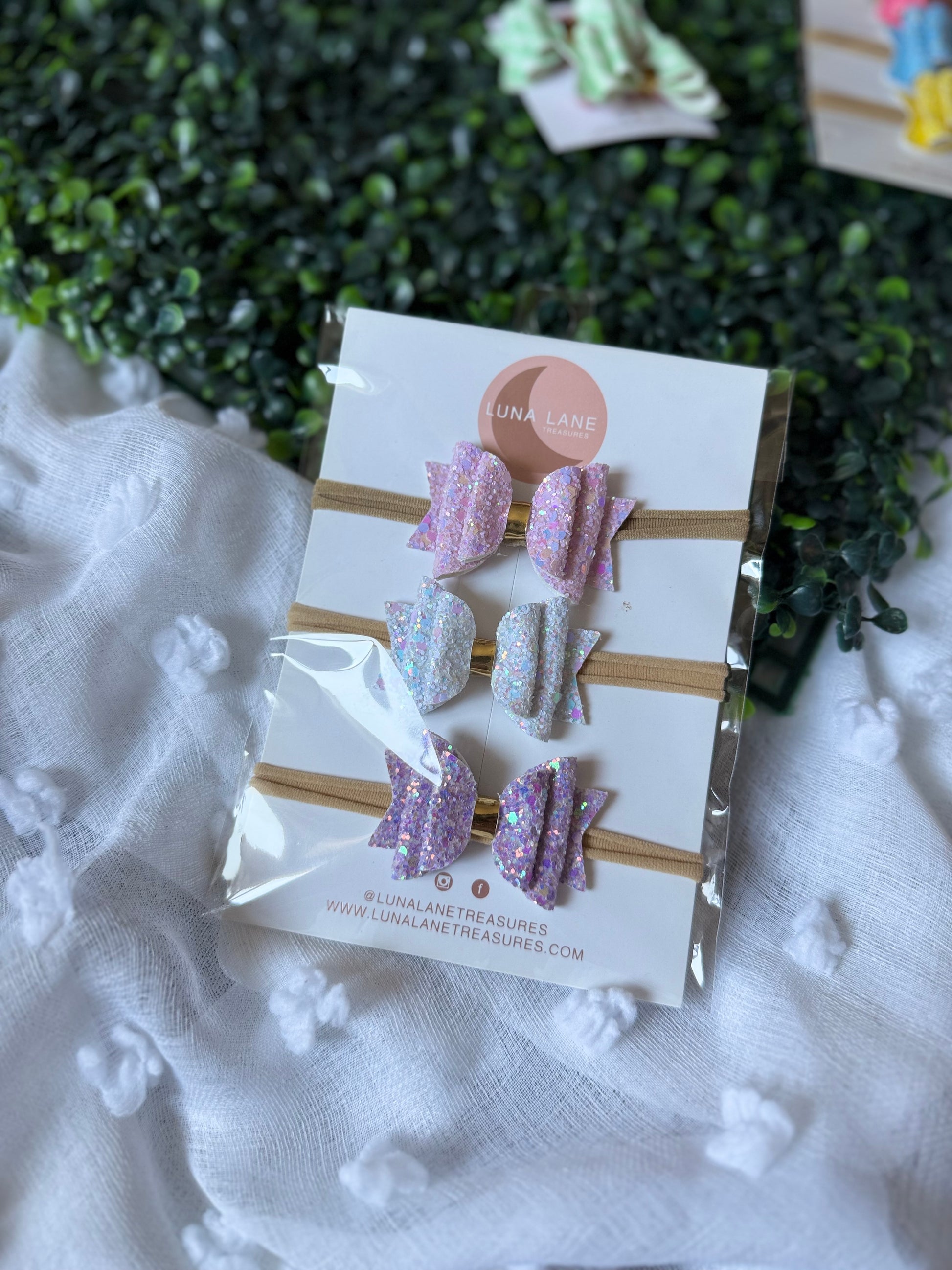Enhance your style and support with our enchanted 3 Bow Set. This set features a 3.5 inch wide bow with beige and white glitter, as well as a printed bow, both attached to secure alligator clips. Add a playful touch to your outfit with ease.