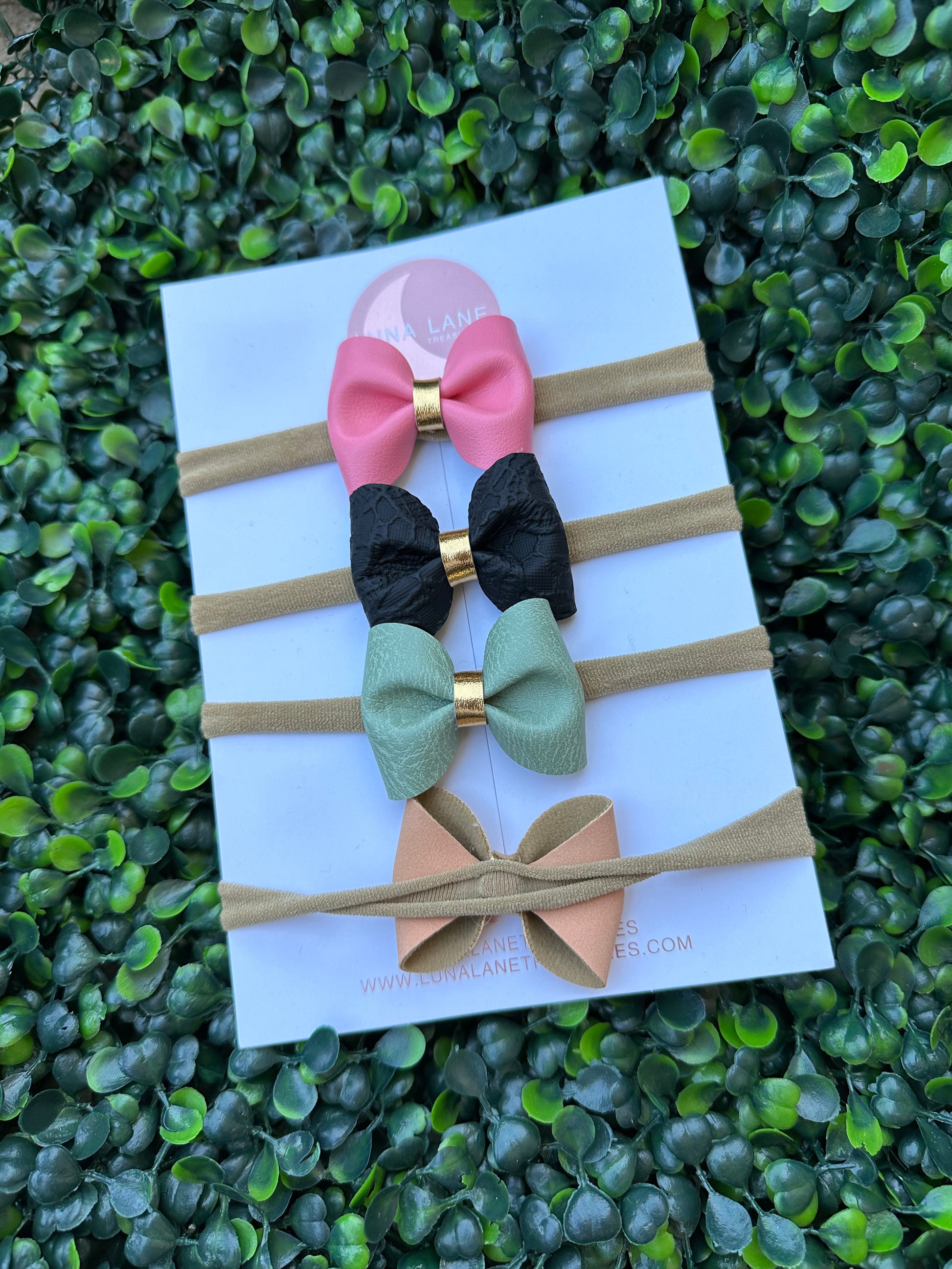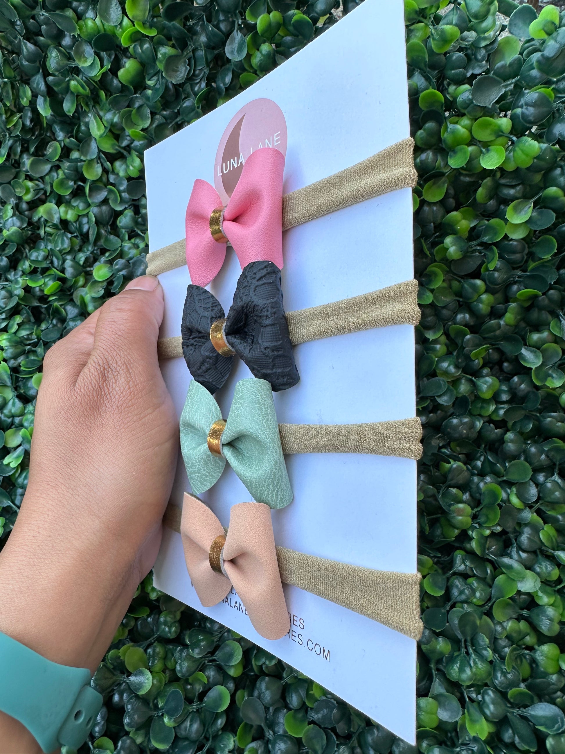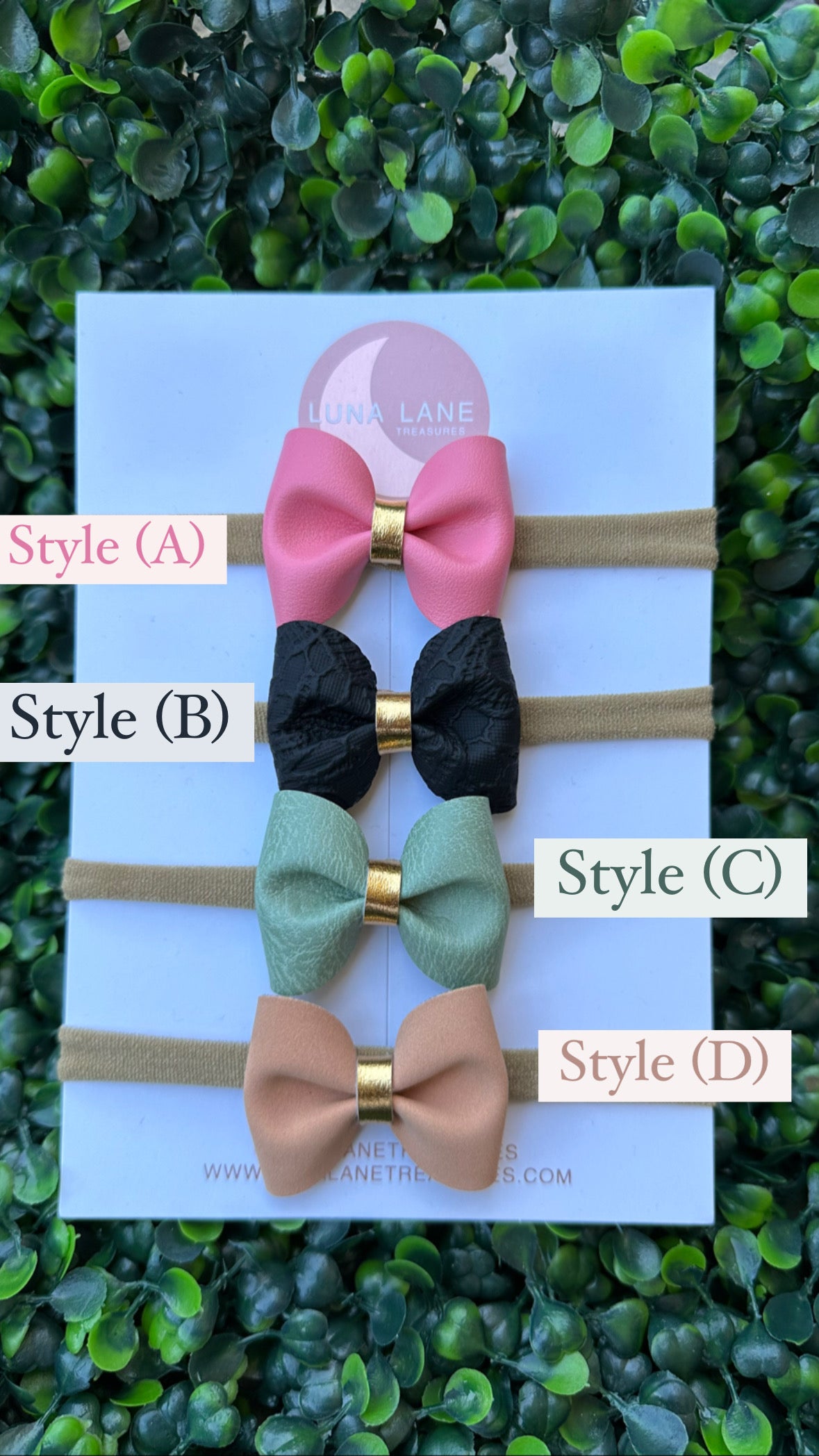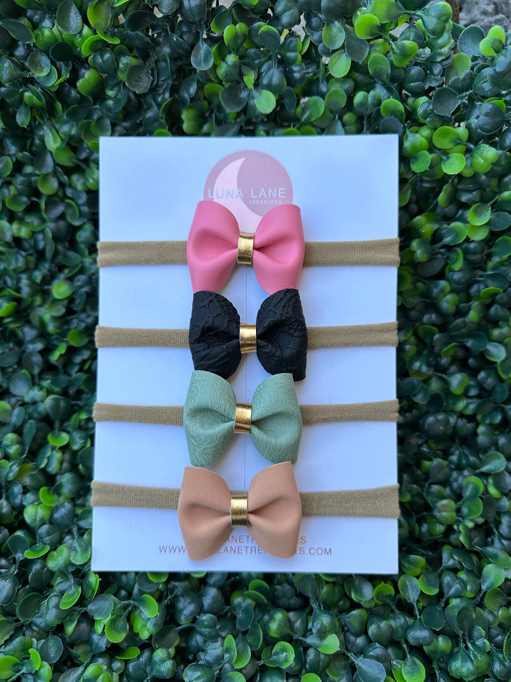 Get the look and feel of luxury with the Minis set of handmade hair bows! Our beautiful vegan leather bows are perfect for any baby's wardrobe and come secured on a rose gold alligator clip or nylon headband. With 4 distinct designs, you can mix up your little one's style or create an adorable matching look. Make your baby stand out in a snap with the Minis set!