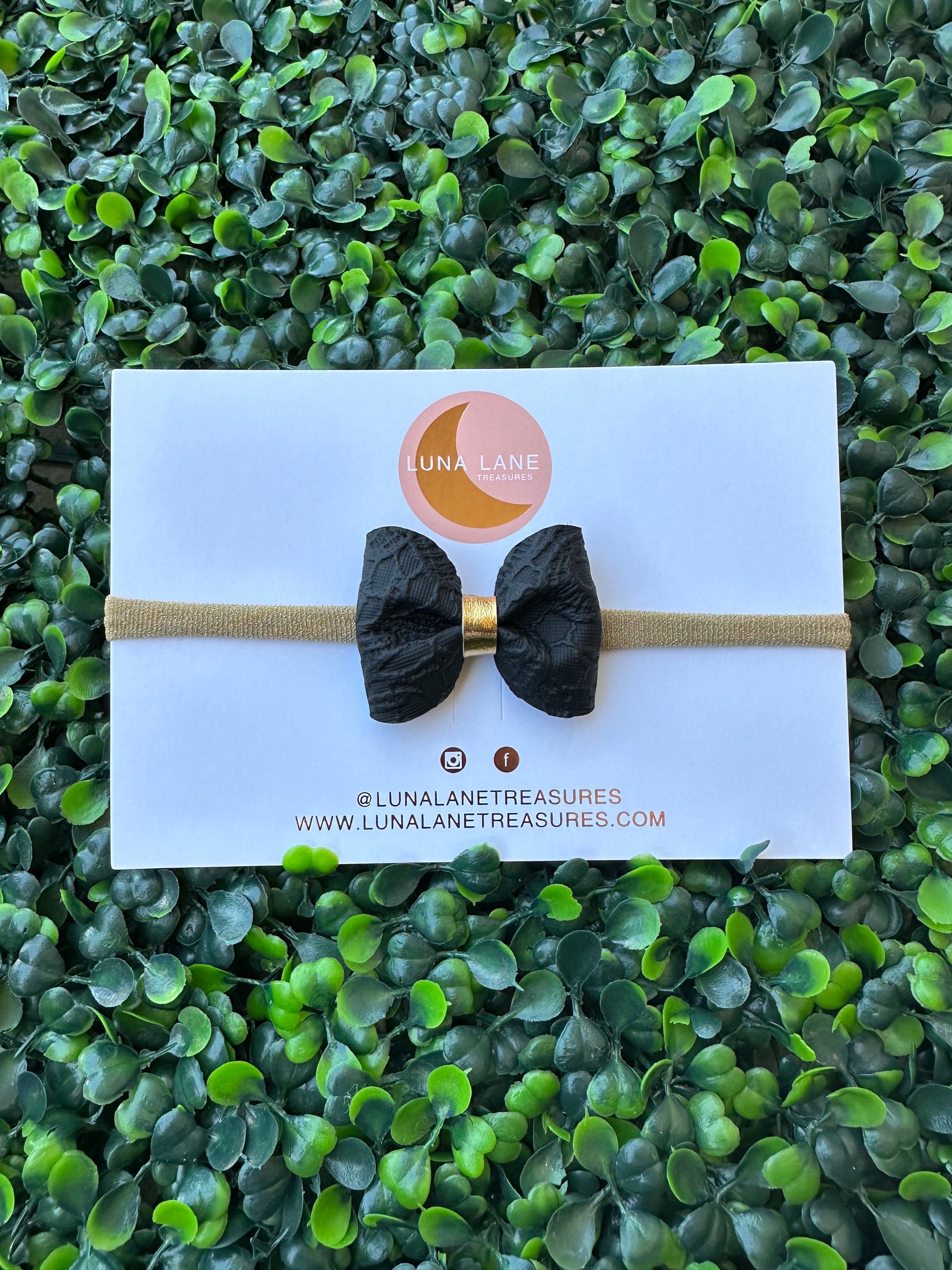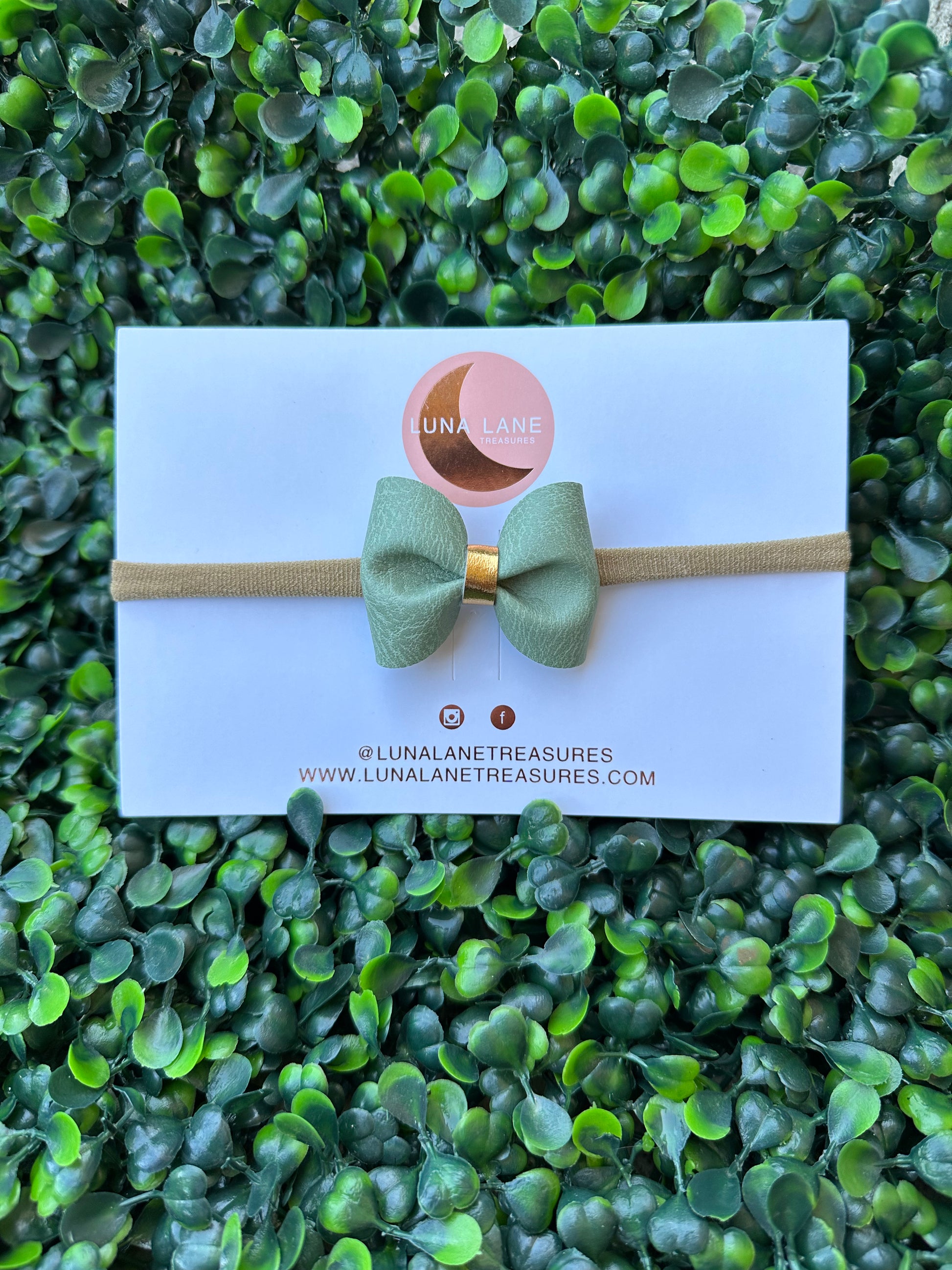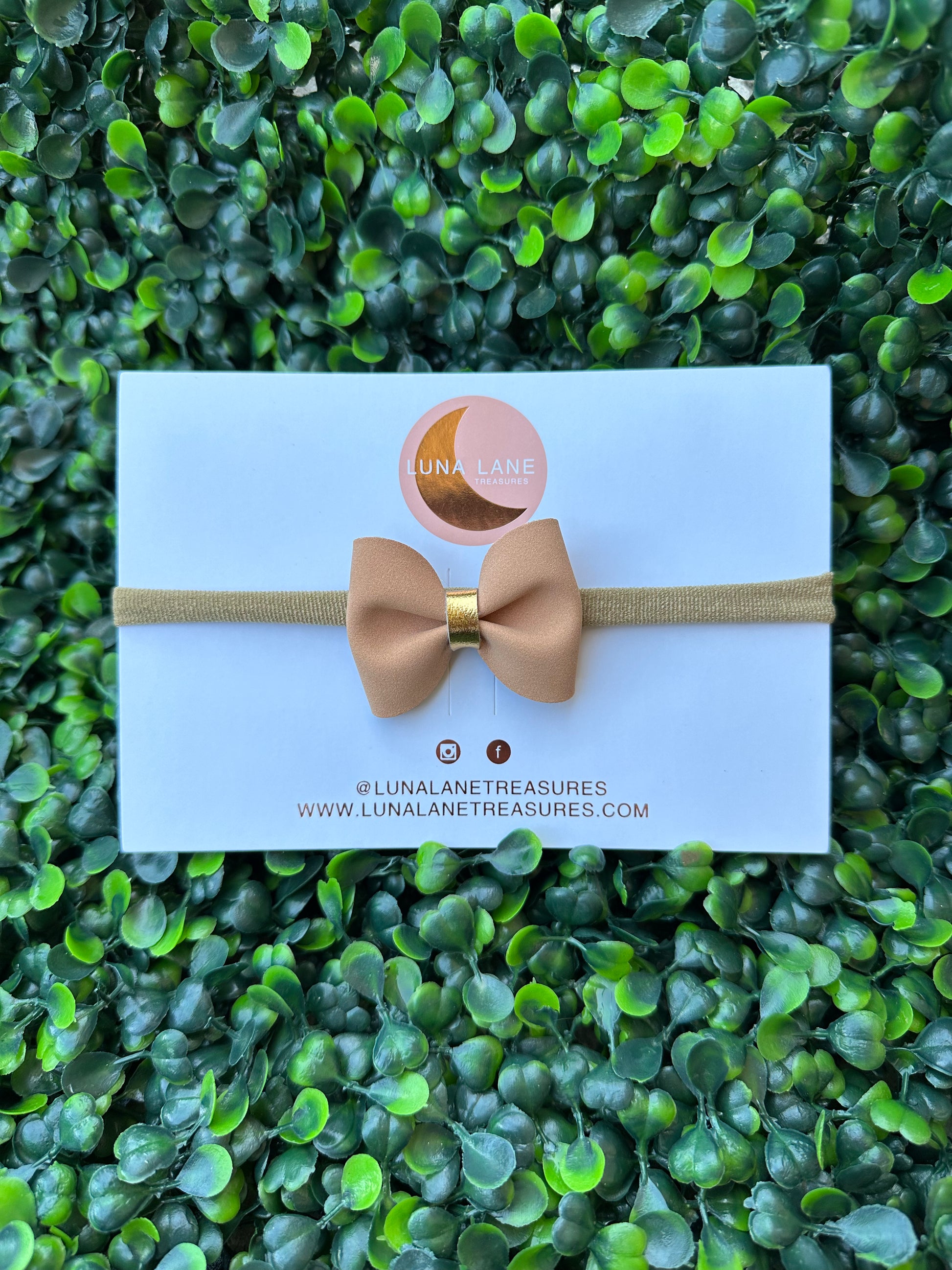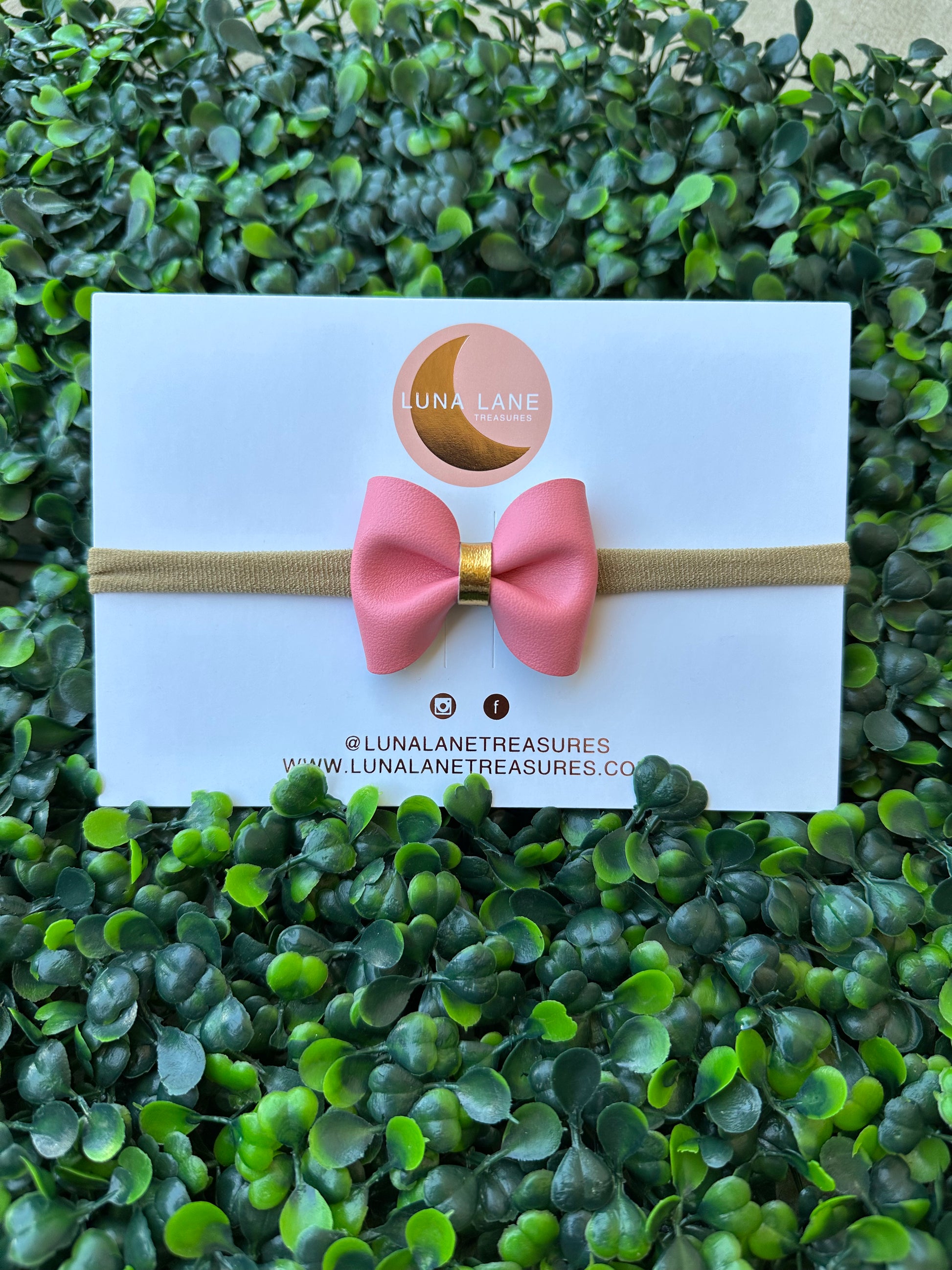 Get the look and feel of luxury with the Minis set of handmade hair bows! Our beautiful vegan leather bows are perfect for any baby's wardrobe and come secured on a rose gold alligator clip or nylon headband. With 4 distinct designs, you can mix up your little one's style or create an adorable matching look. Make your baby stand out in a snap with the Minis set!