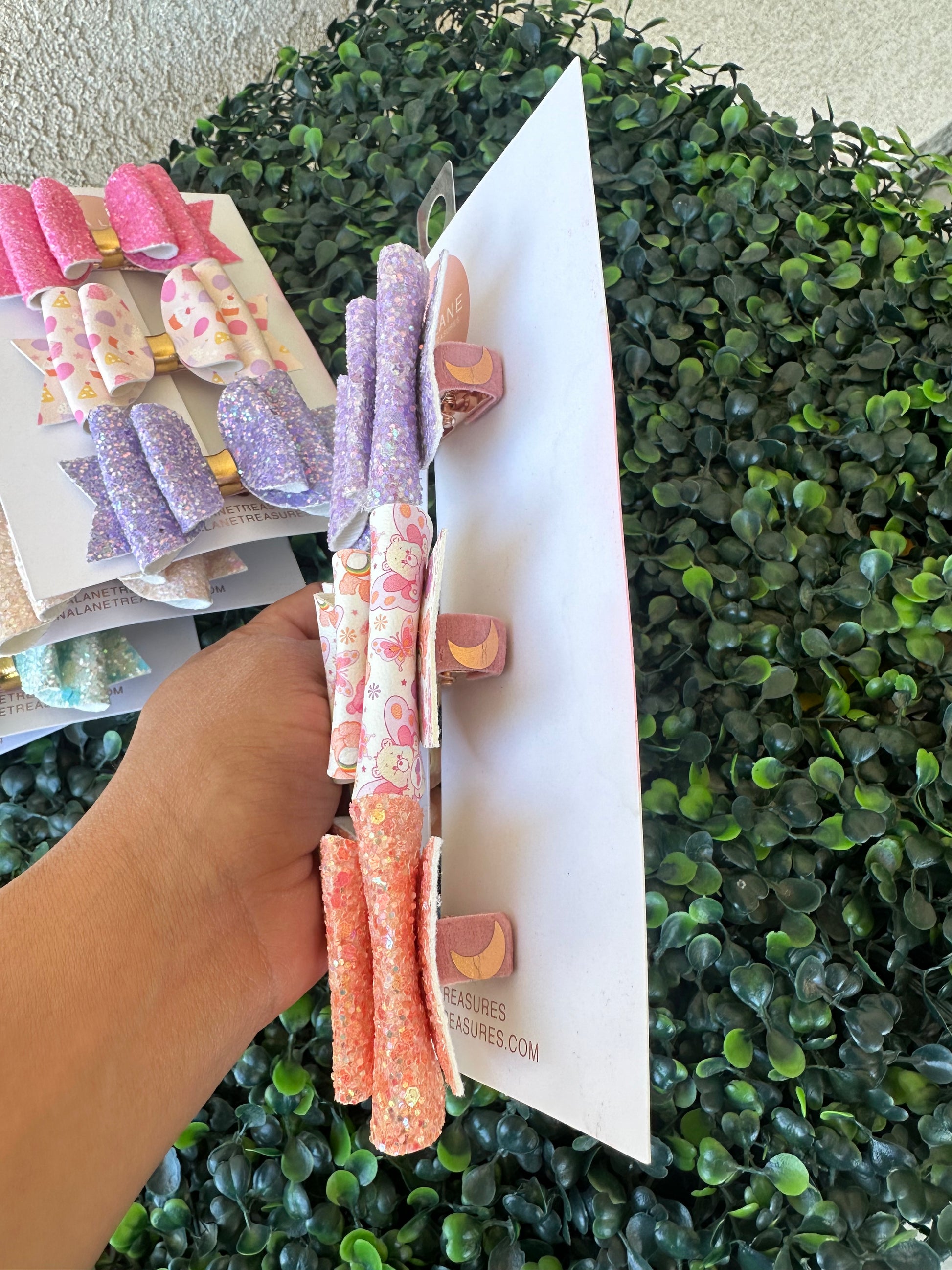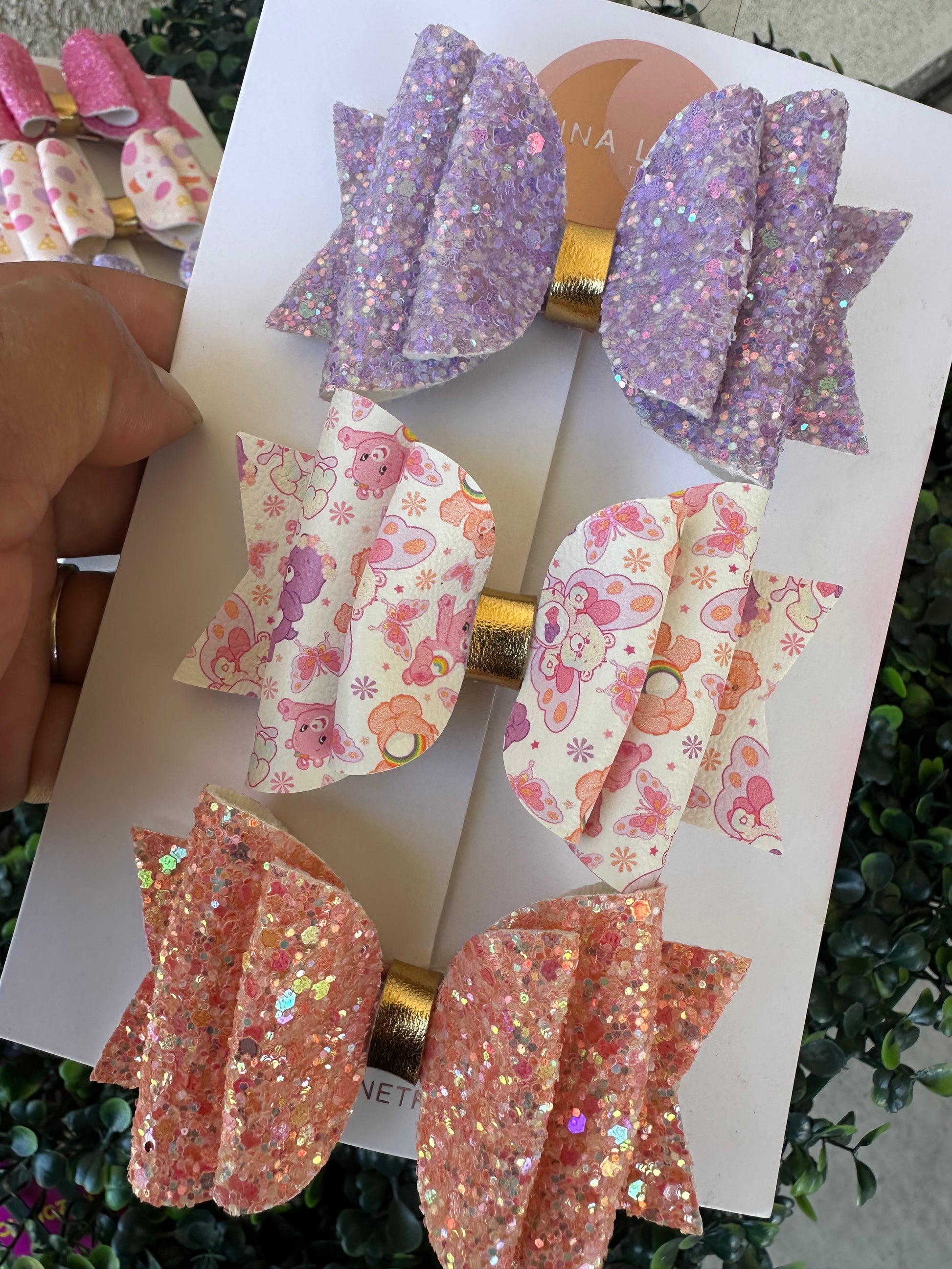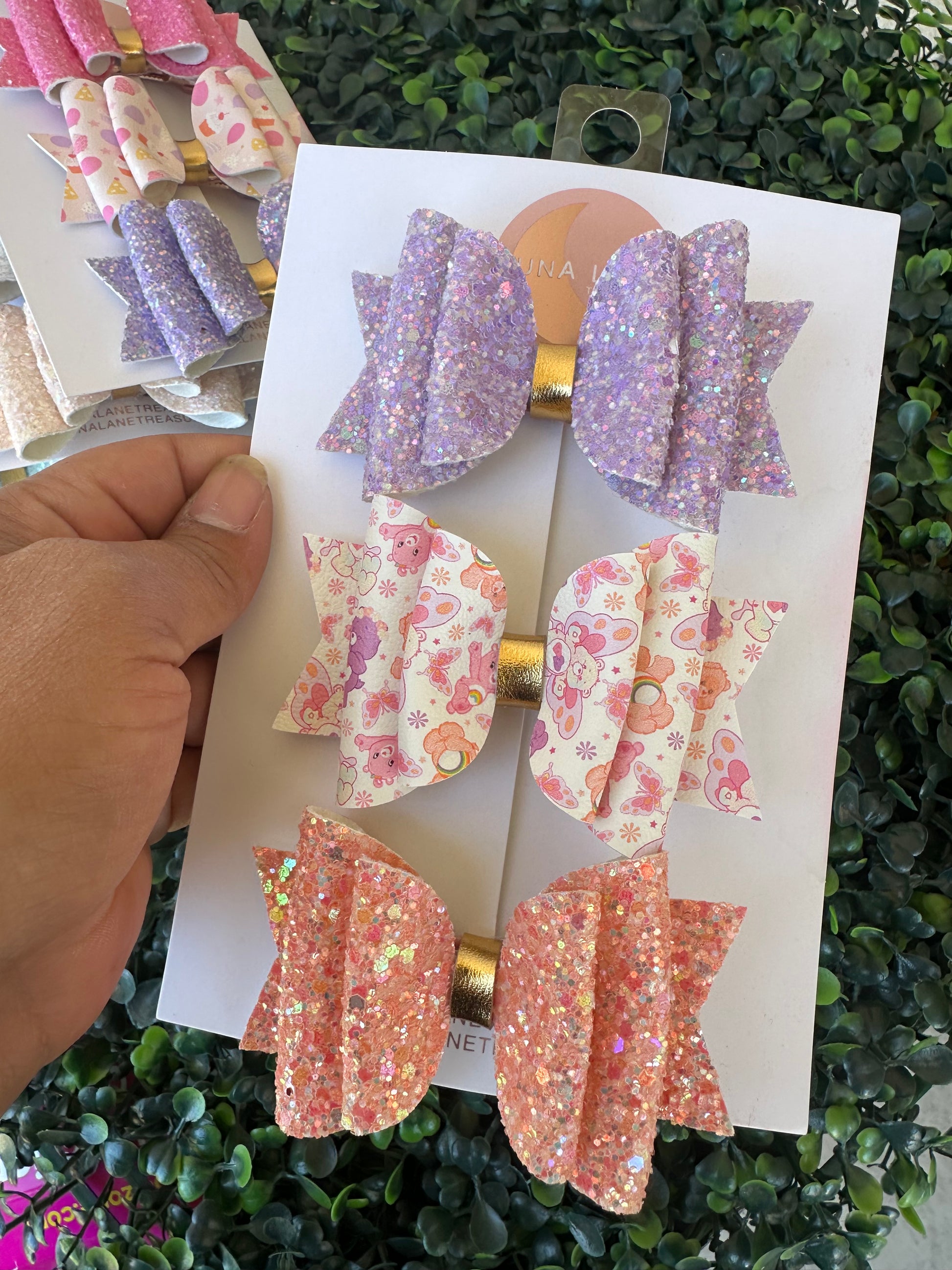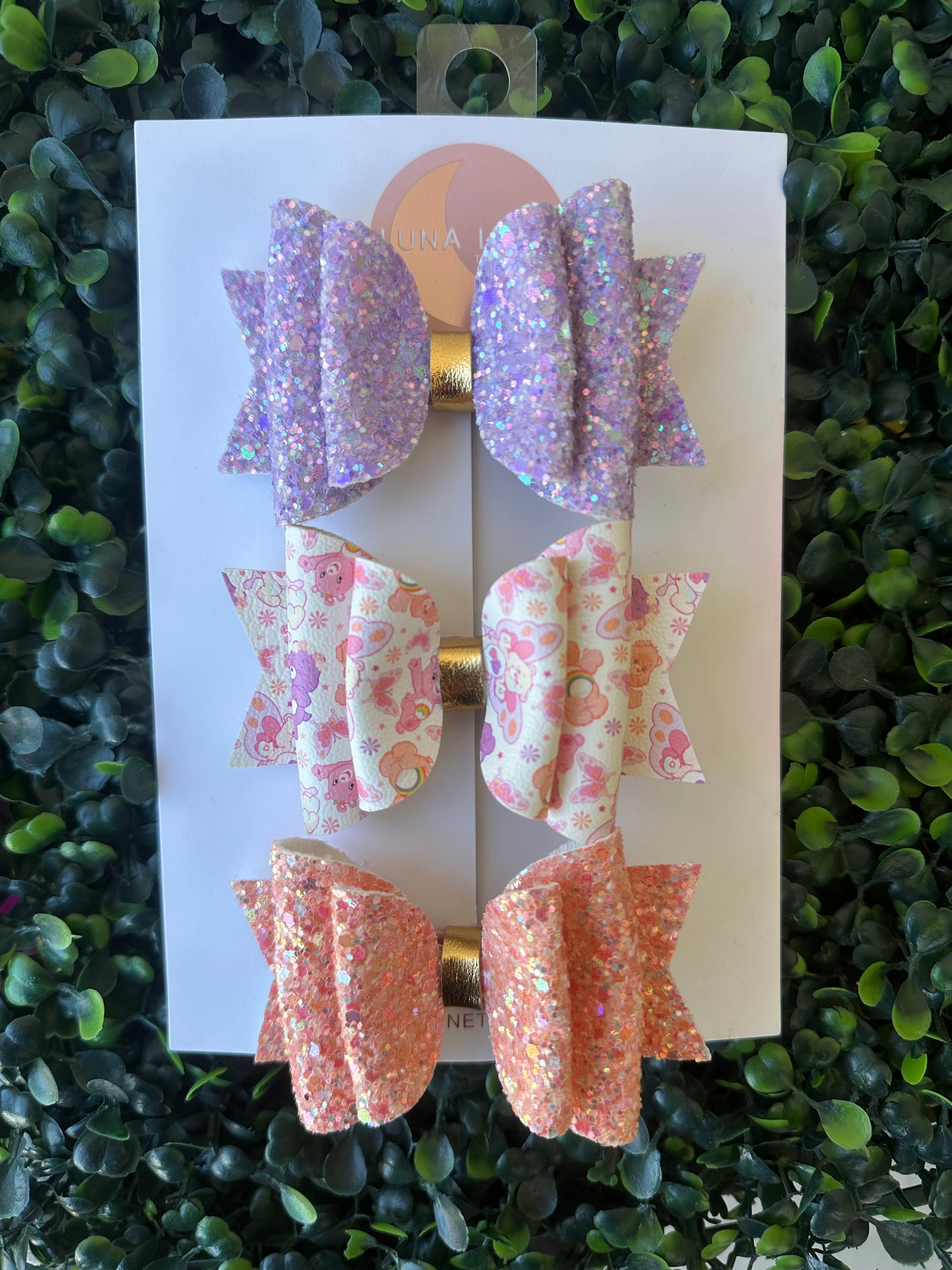 Stay stylish and supported with our Bears That Care 3 Bow Set. This set includes a 3.5 inch wide purple and peach glitter bow, as well as a fun printed bow, all attached to align alligator clips. Perfect for adding a touch of playfulness to any outfit.