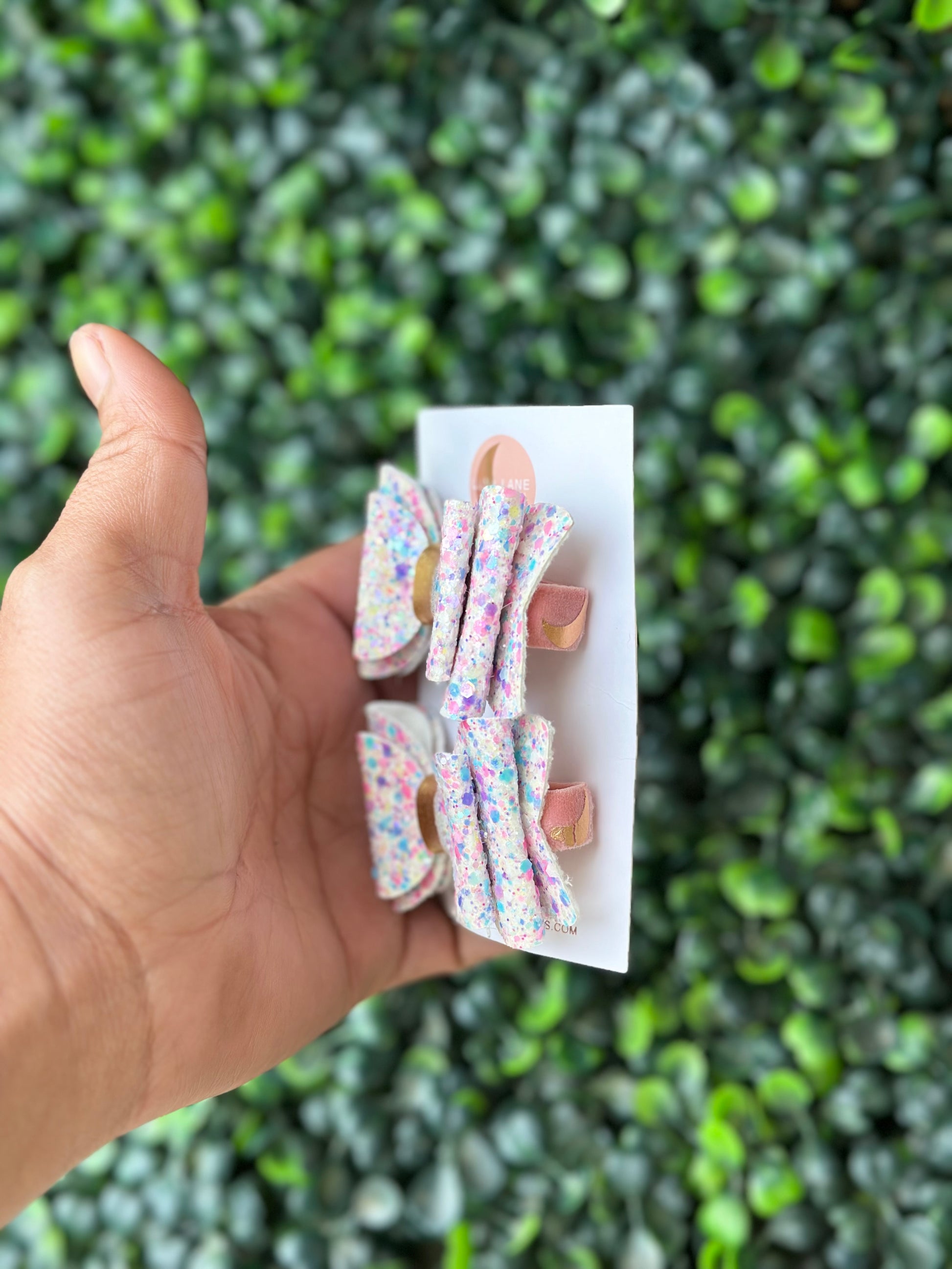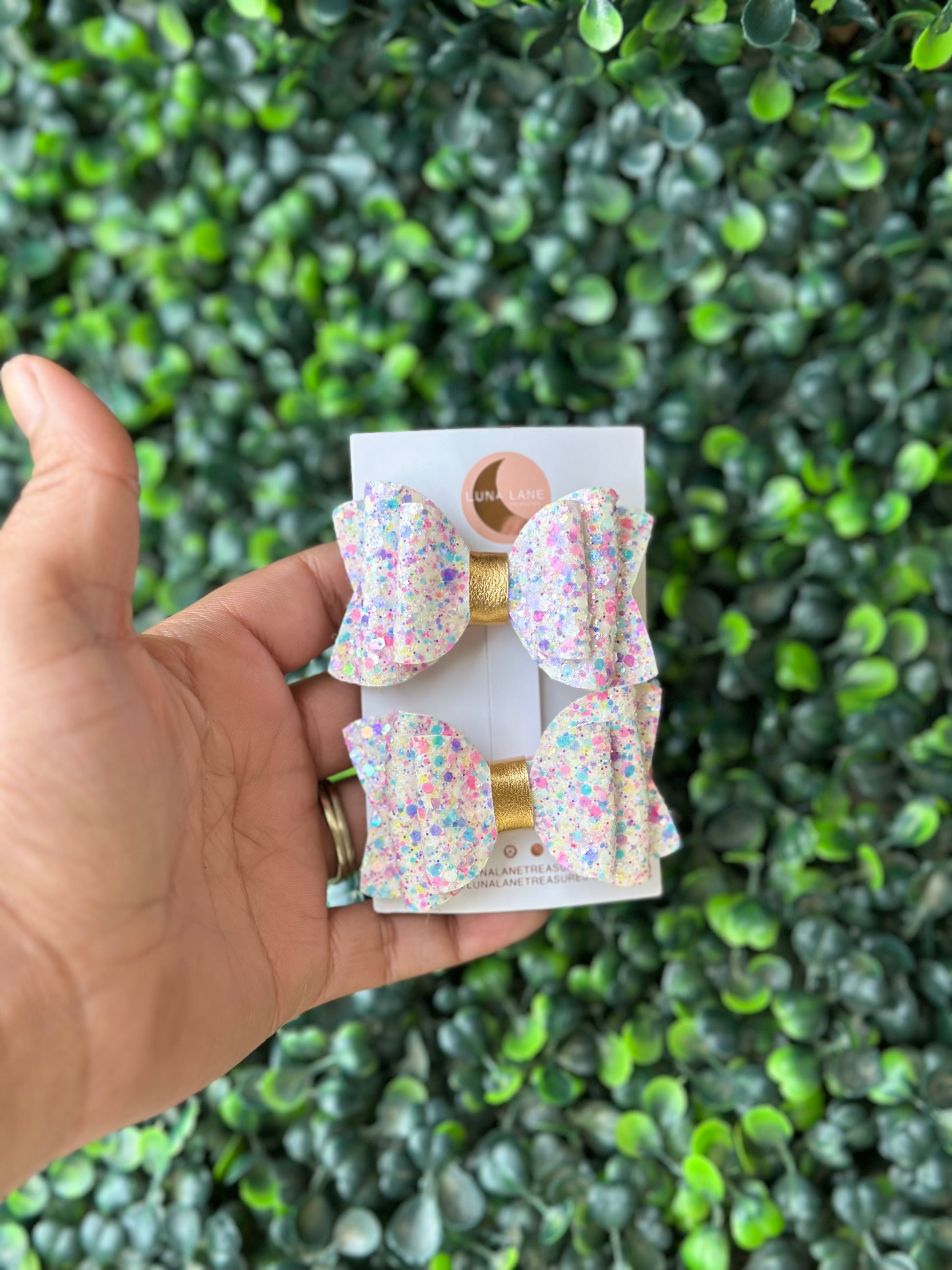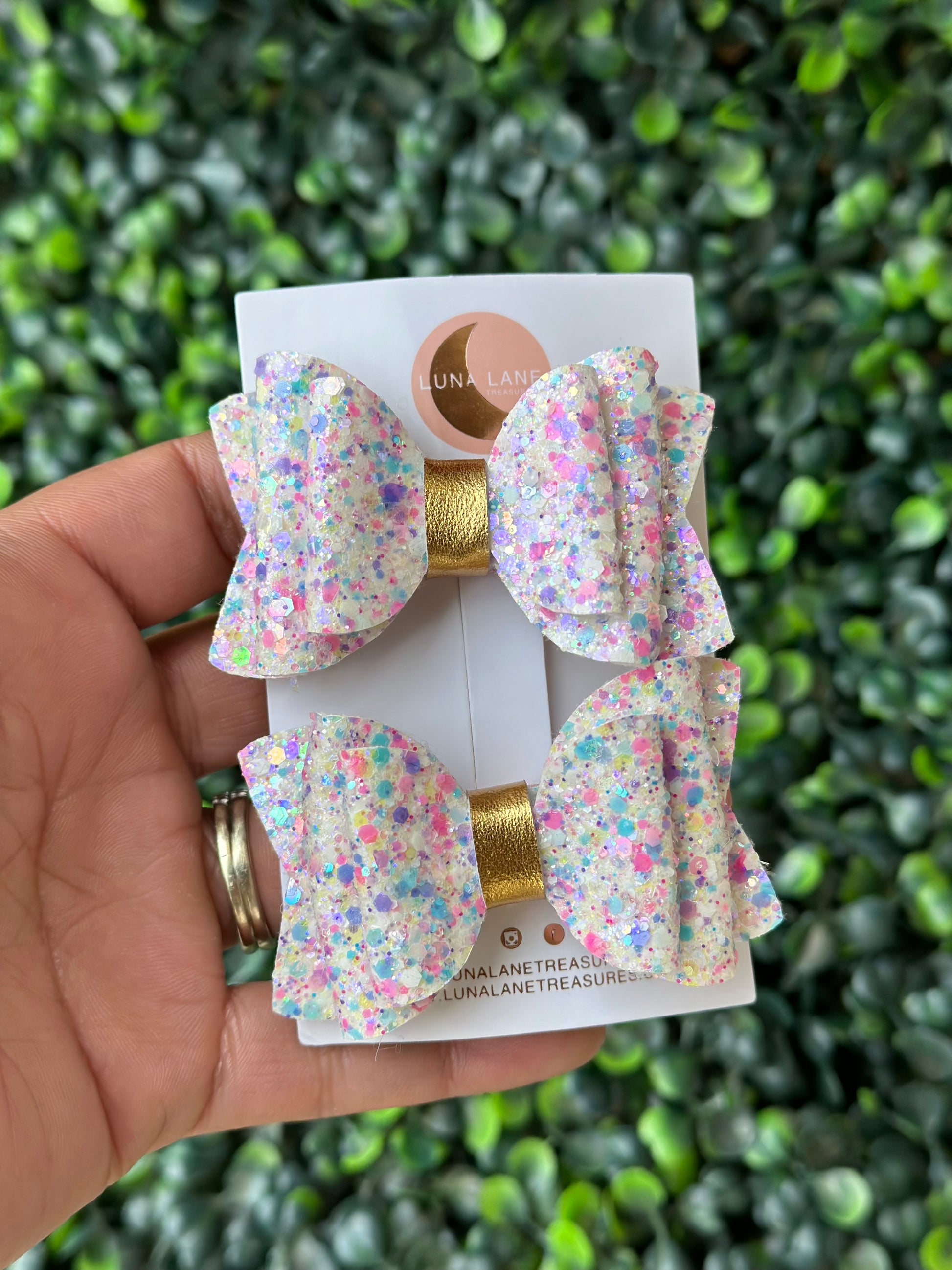 Elevate your fashion sense with our opulent pink and blue glitter Bow Pigtails. Each bow boasts a 2.5-inch size and is meticulously made with vegan glitter fabric, held in place by a 2-inch rose gold alligator clip wrapped in luscious velvet ribbon. Rest easy knowing your hair will stay in perfect shape all day long with our reliable pigtails.