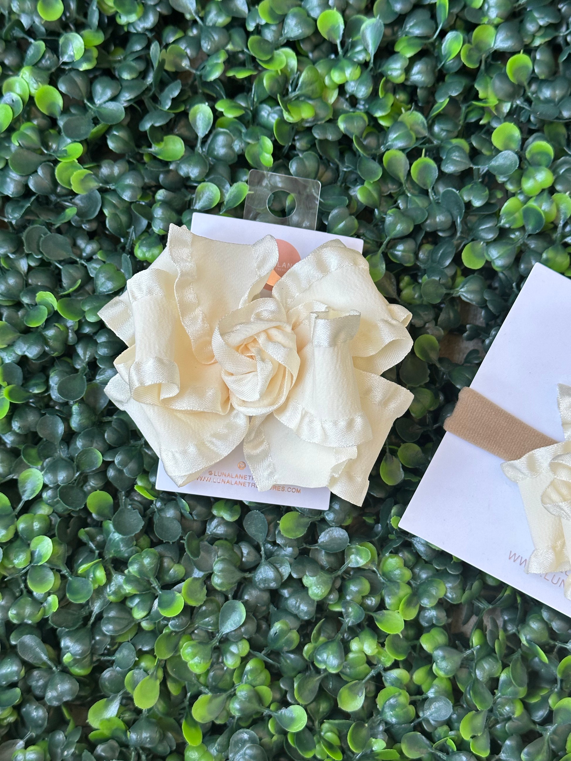 This listing includes 1 bows featured in the image, each measuring approximately 4 inches wide. The bows feature Layered Ruffle ribbon and are attached to a stretchy nylon headband, suitable for most infants. Give your little one's outfit the perfect finishing touch with these Ivory Classic Medium Ruffle bows. Measuring approximately 4 inches wide, these bows feature Layered Ruffle ribbon and are attached to a stretchy nylon headband, suitable for most infants. With these bows, your baby will be stylish and comfortable all day long.