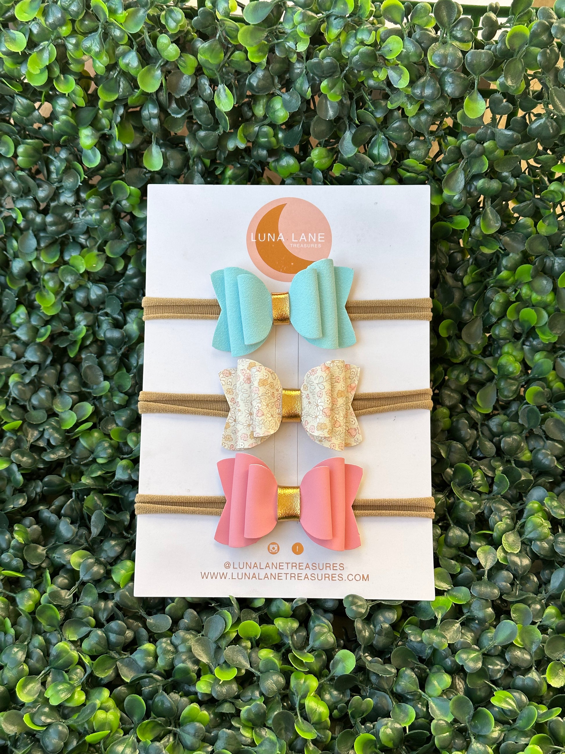 Our Georgina Set includes three bows crafted from vegan glitter leather, each measuring 2.5" wide. Every bow is attached to an adjustable headband or an alligator clip, which provides a secure fit for newborns and infants. Our unique set offers a great way to dress up your little one's look!
