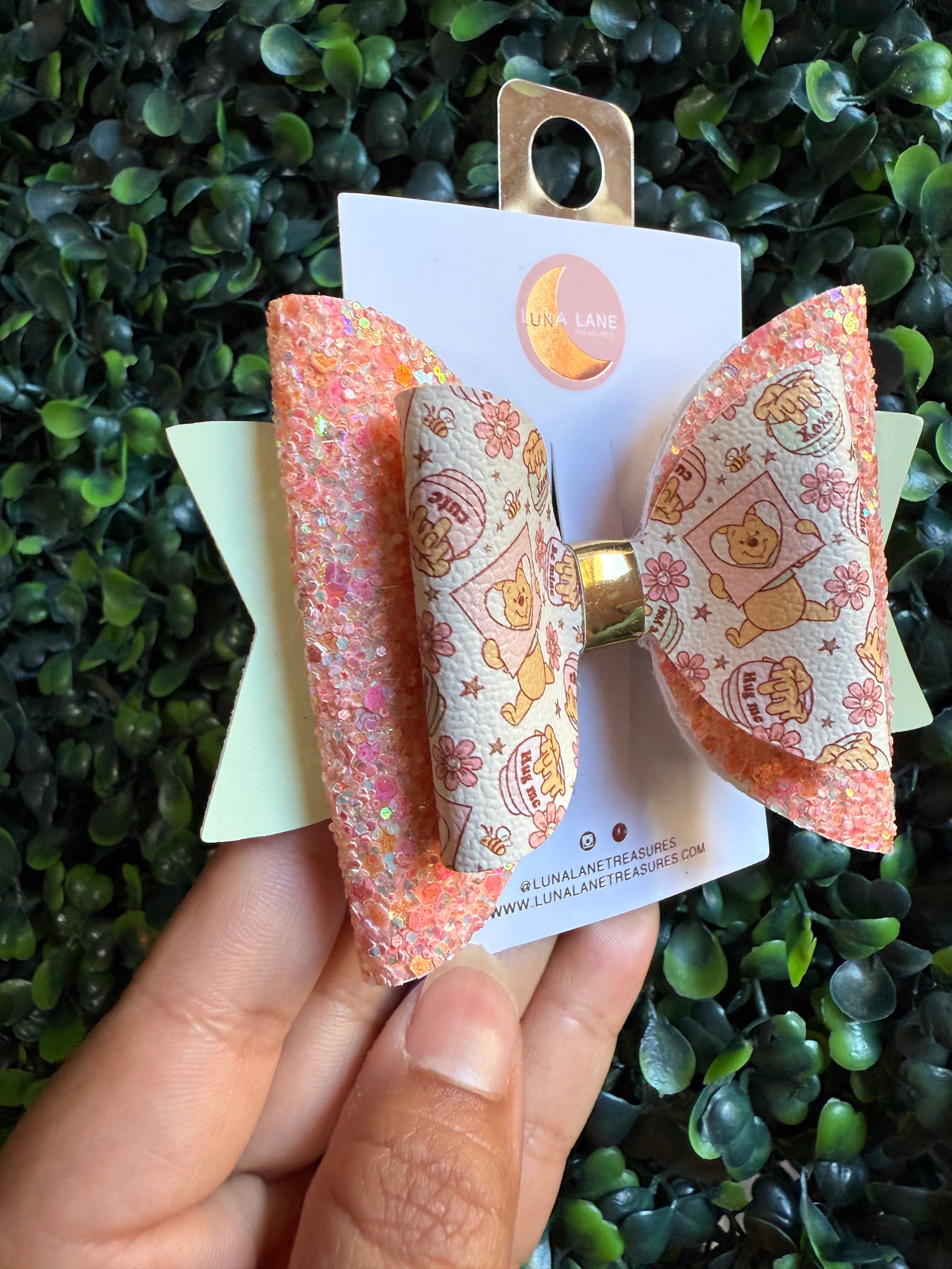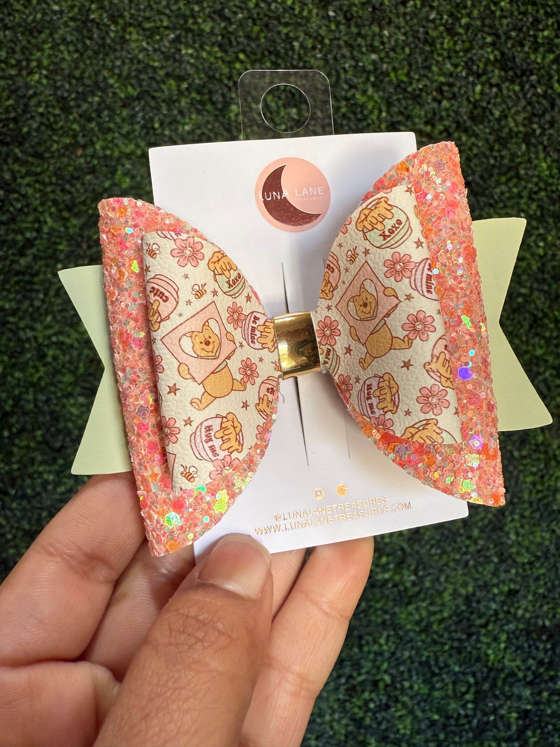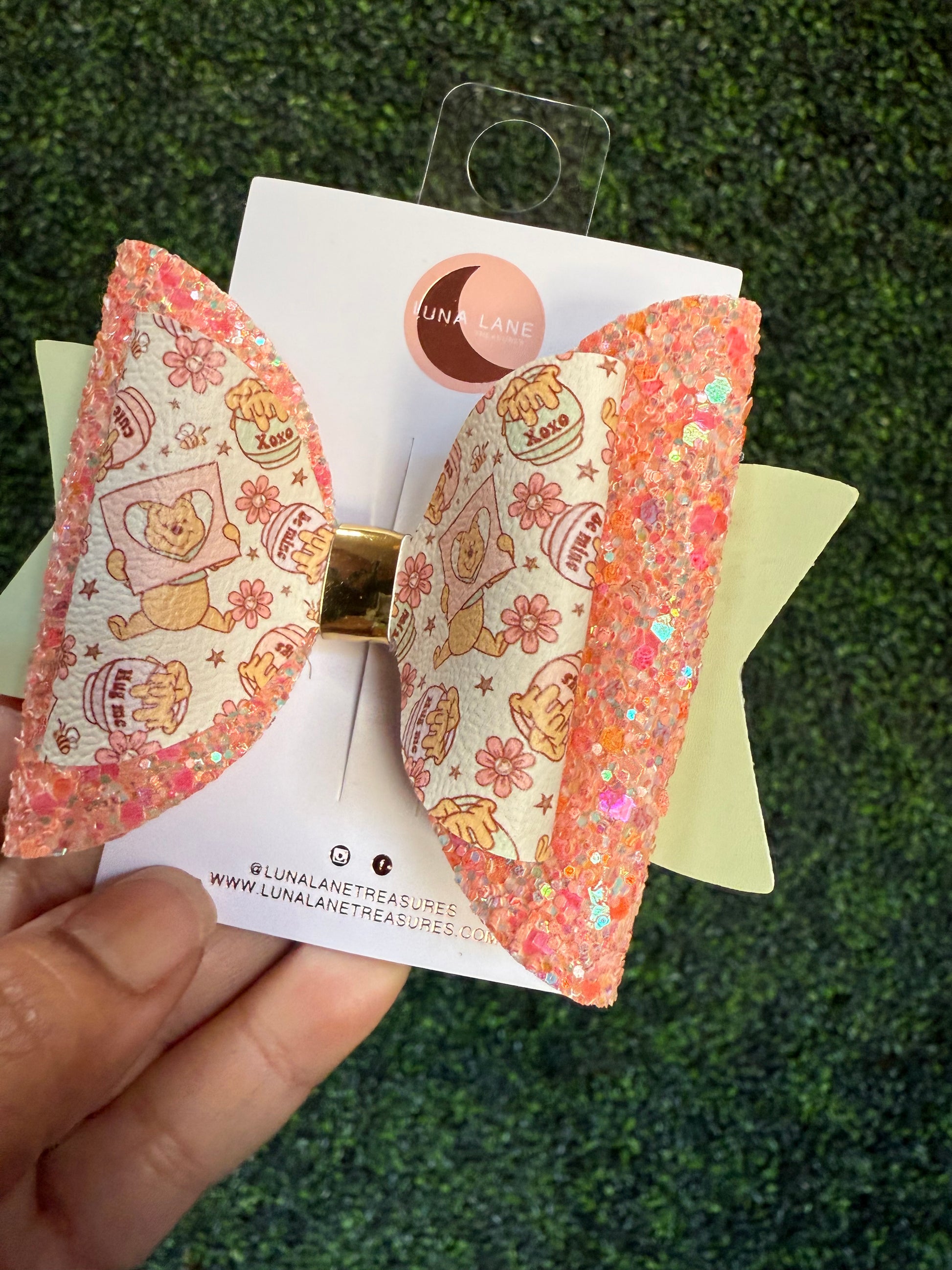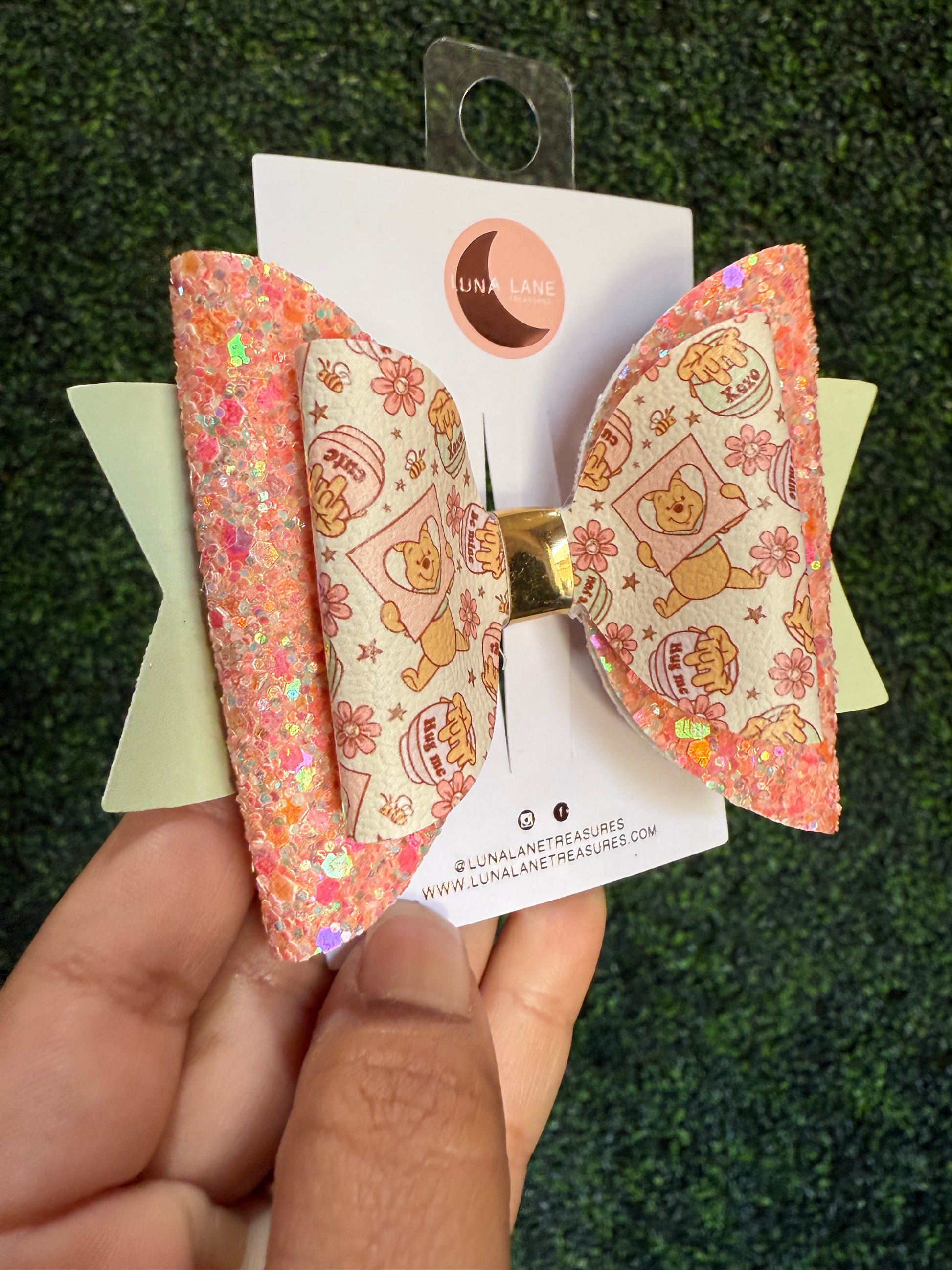 Bring storybook sweetness to your little one’s look with our handcrafted Pooh’s Garden Daydream Bow! This oversized 4.5-inch bow features a soft and whimsical Winnie the Pooh print paired with dreamy layers of mint and peach tones. The sweet color combo and nostalgic design make it perfect for spring days, photoshoots, or just adding a little magic to the everyday. Finished with a velvet-lined alligator clip for a snug, gentle grip that stays in place.