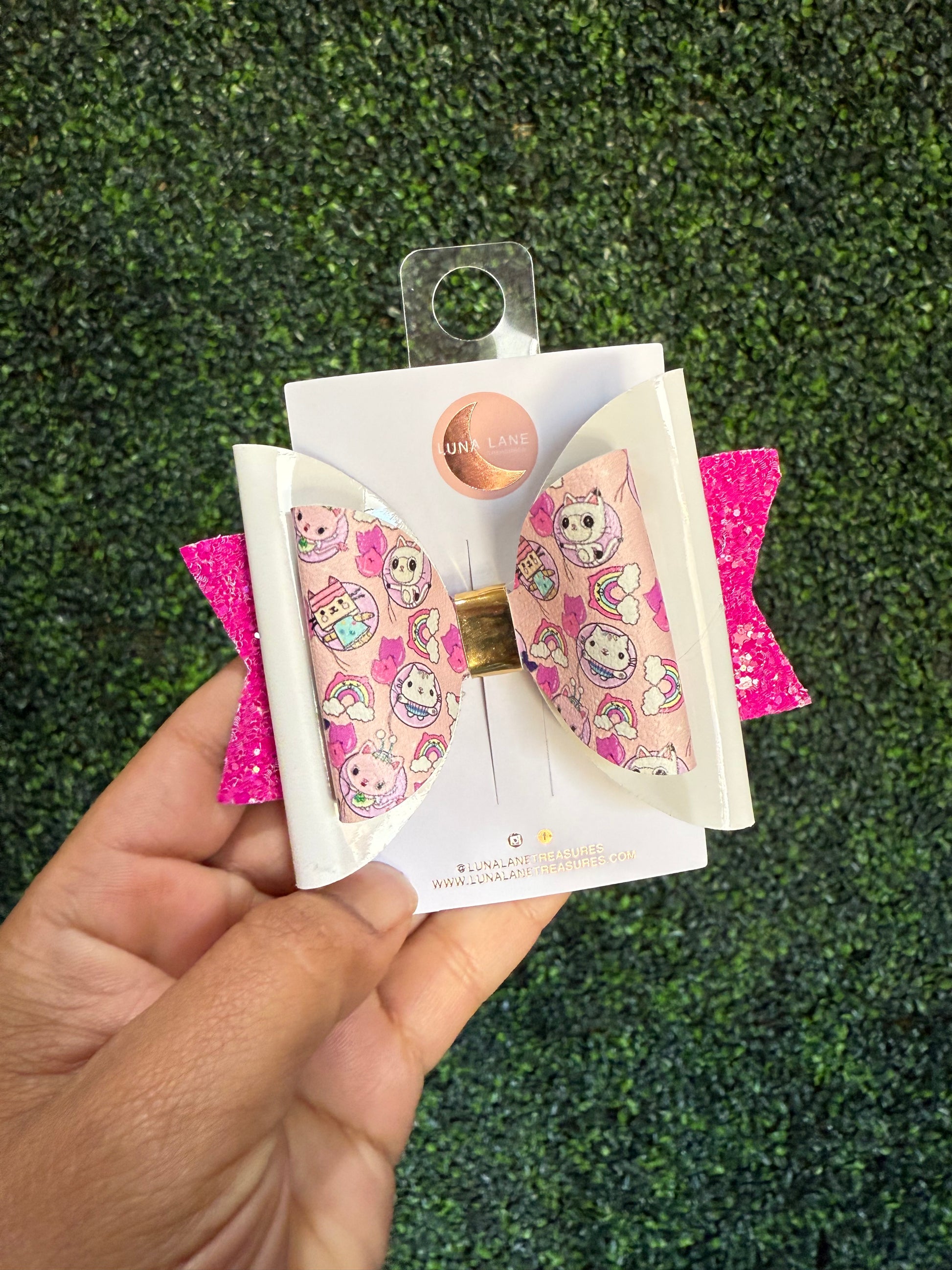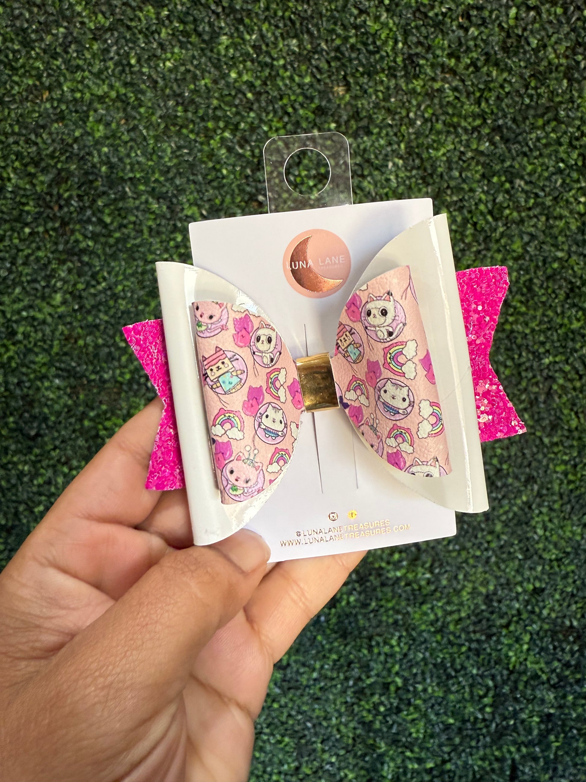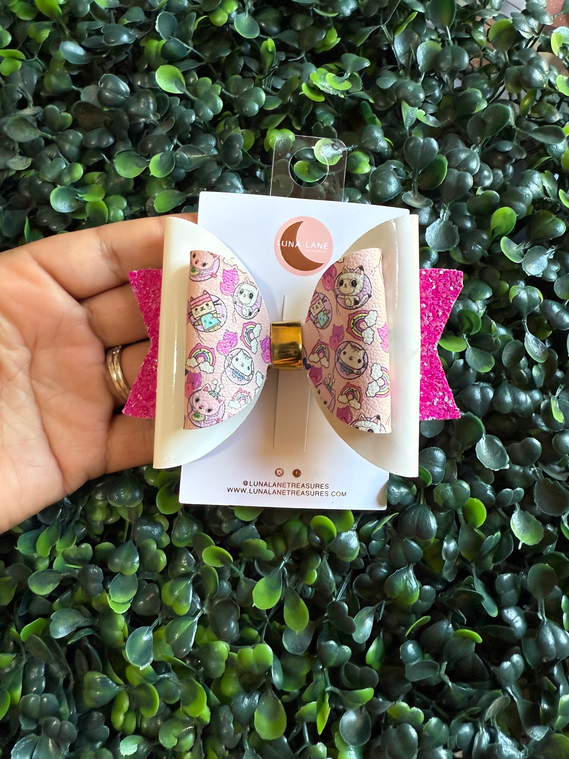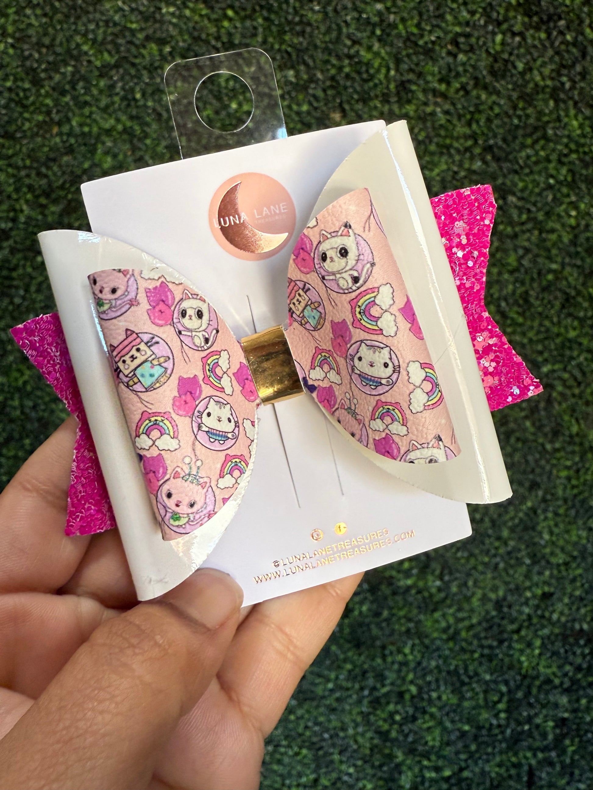 Add a burst of fun and color with our bold and playful Gabby’s Glam Bow! Measuring 4.5 inches wide, this handmade beauty features a bright fuchsia pink base, crisp white accents, and an adorable Gabby’s Dollhouse print that’s full of charm and character. Perfect for little fans of Gabby and her magical world, this bow is finished with a velvet-lined alligator clip to keep hairstyles looking cute and secure all day long.