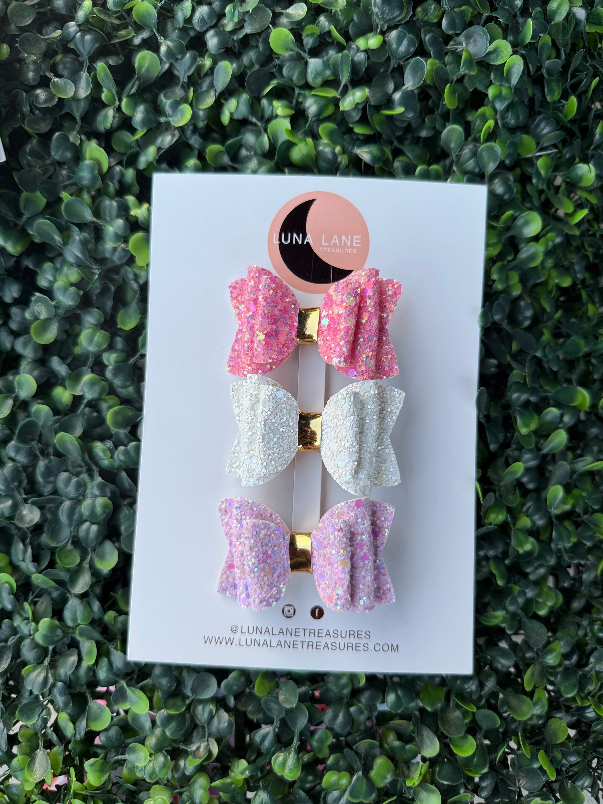 Enhance your style and support with our enchanted 3 Bow Set. This set features a 3.5 inch wide bow with beige and white glitter, as well as a printed bow, both attached to secure alligator clips. Add a playful touch to your outfit with ease.