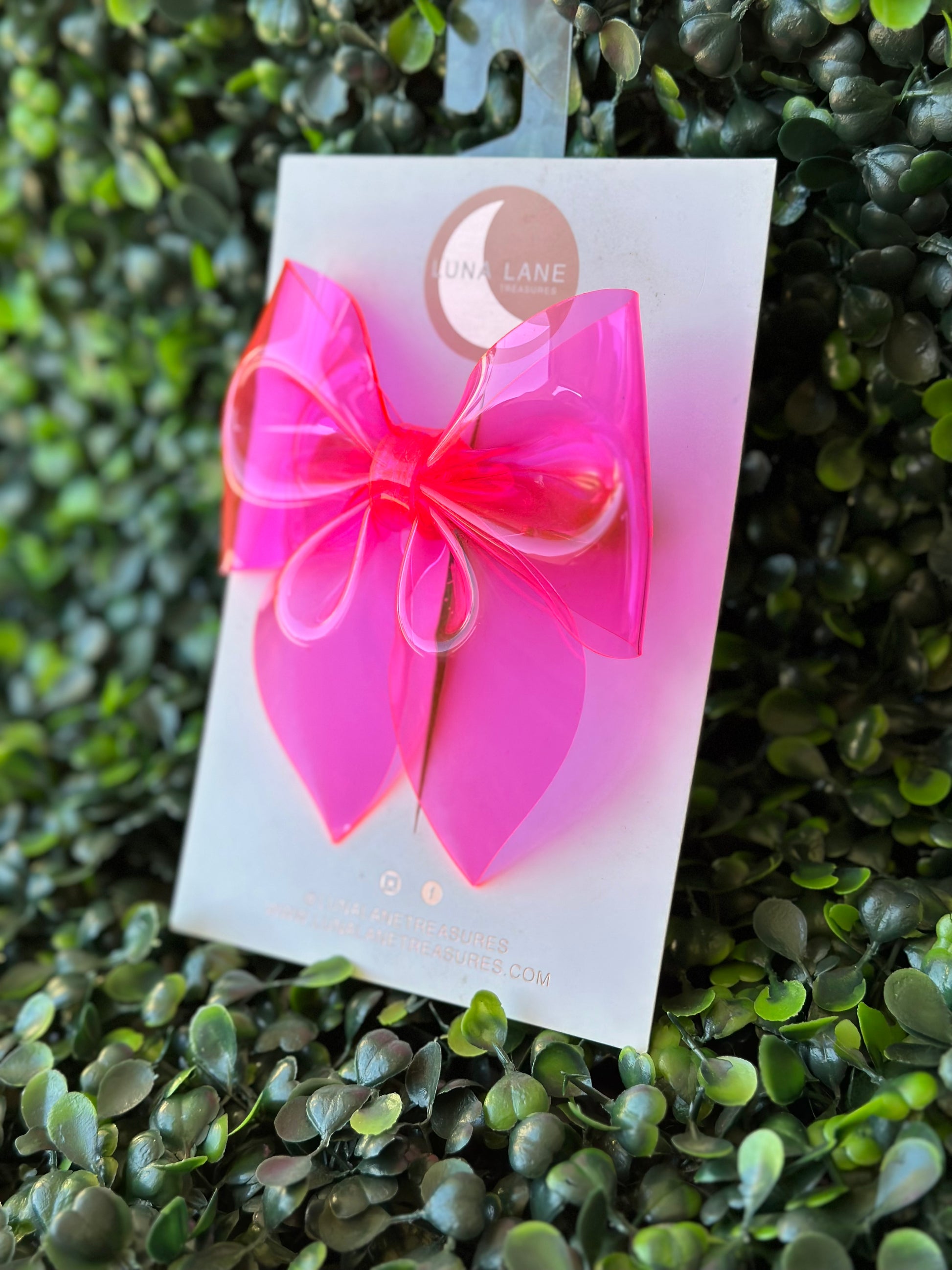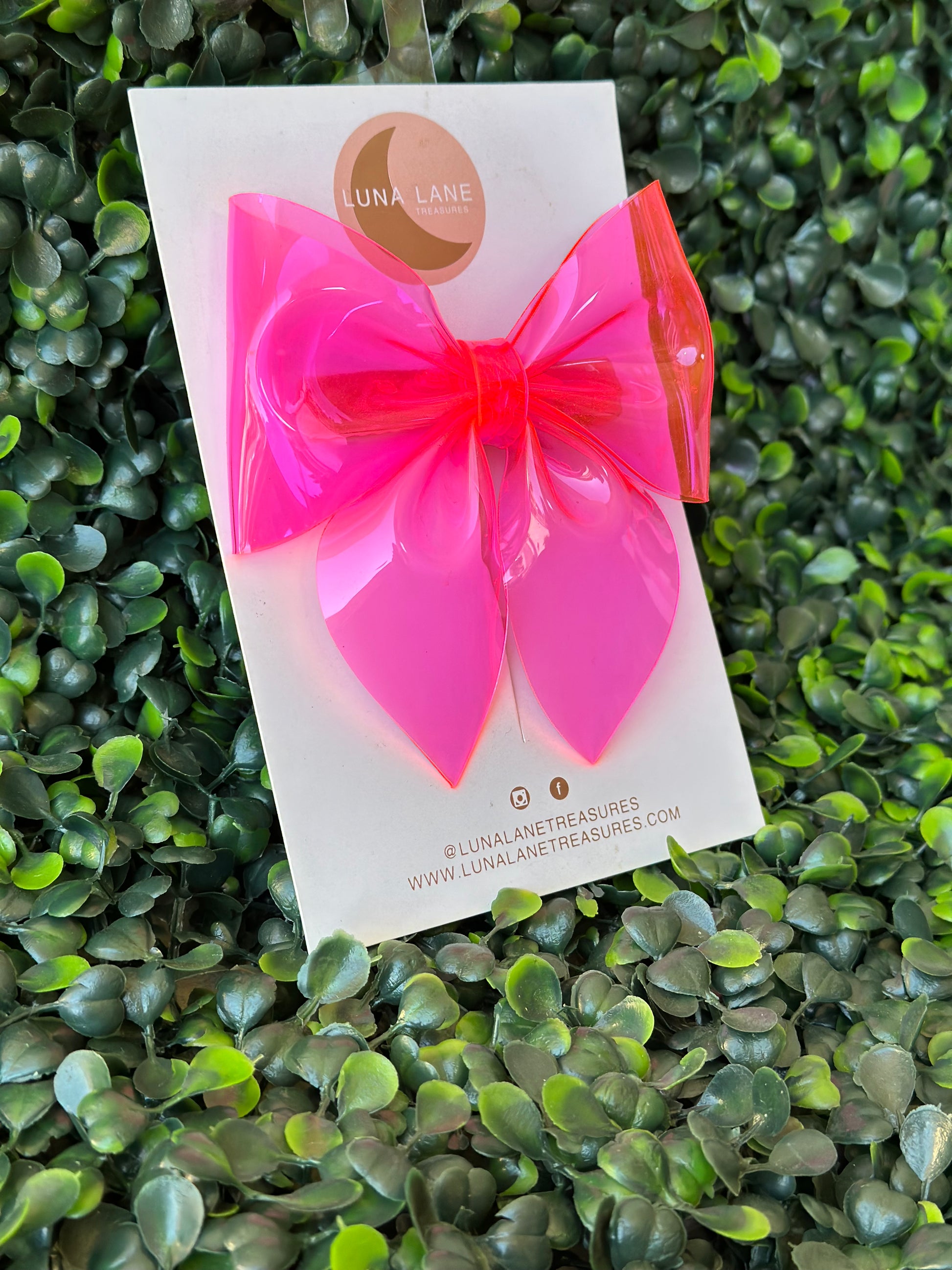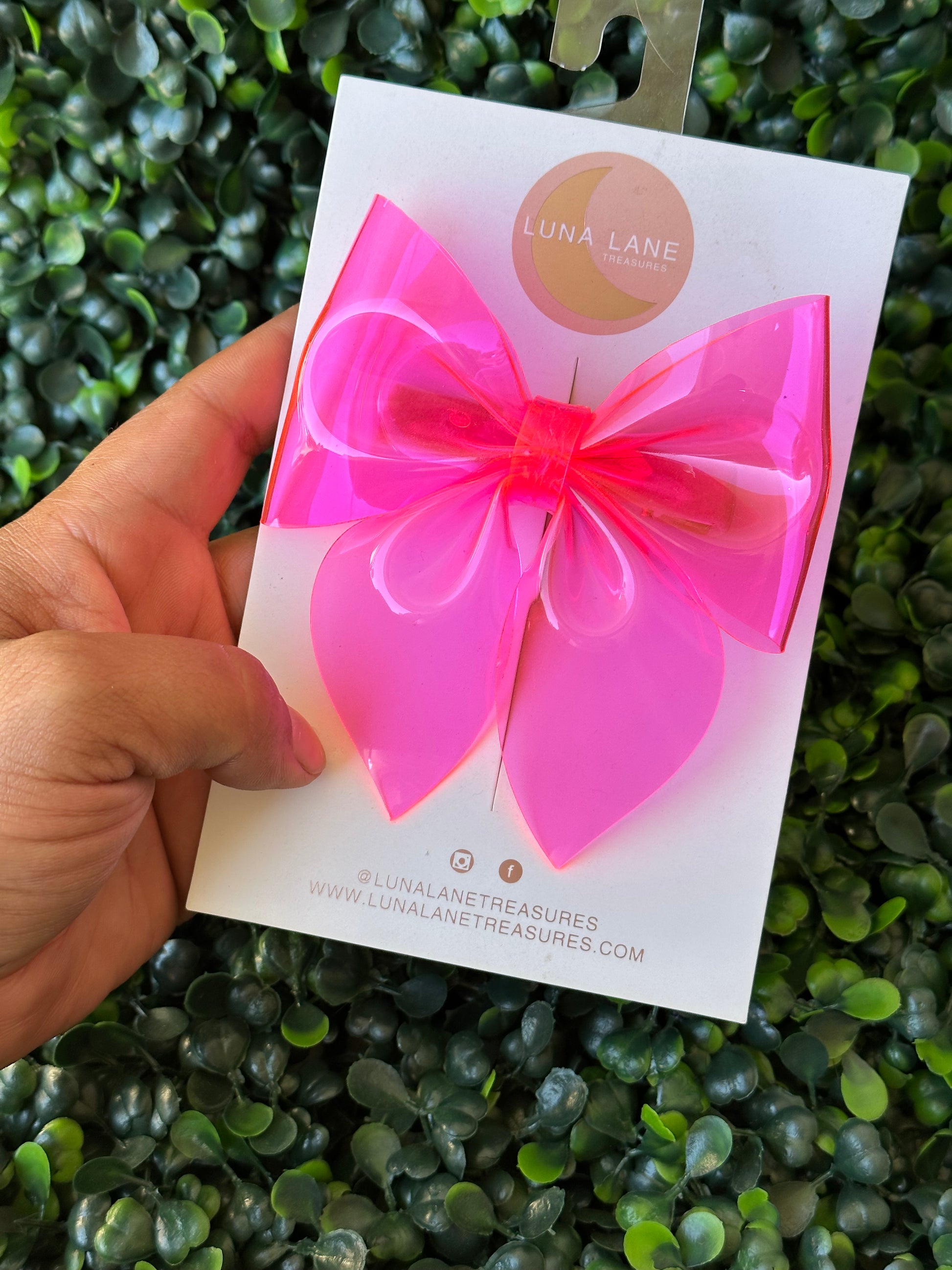 The Neon Clear Pink Sailor Bow is perfect for your little one. It's made with vegan leather and available with either a signature rose gold alligator clip or a sun-themed nylon headband. Each bow measures 4 inches wide, making it the perfect accessory for your little one.