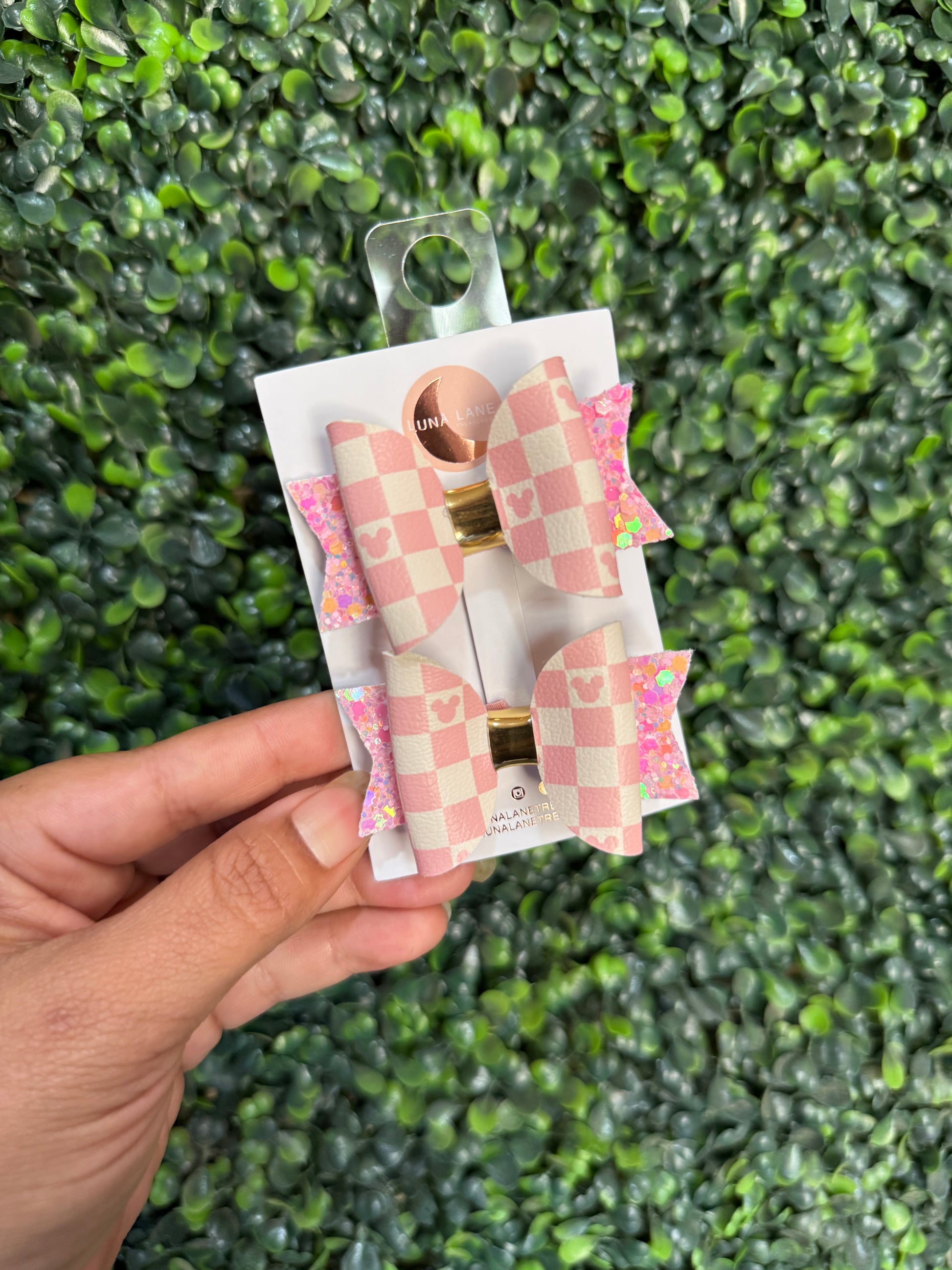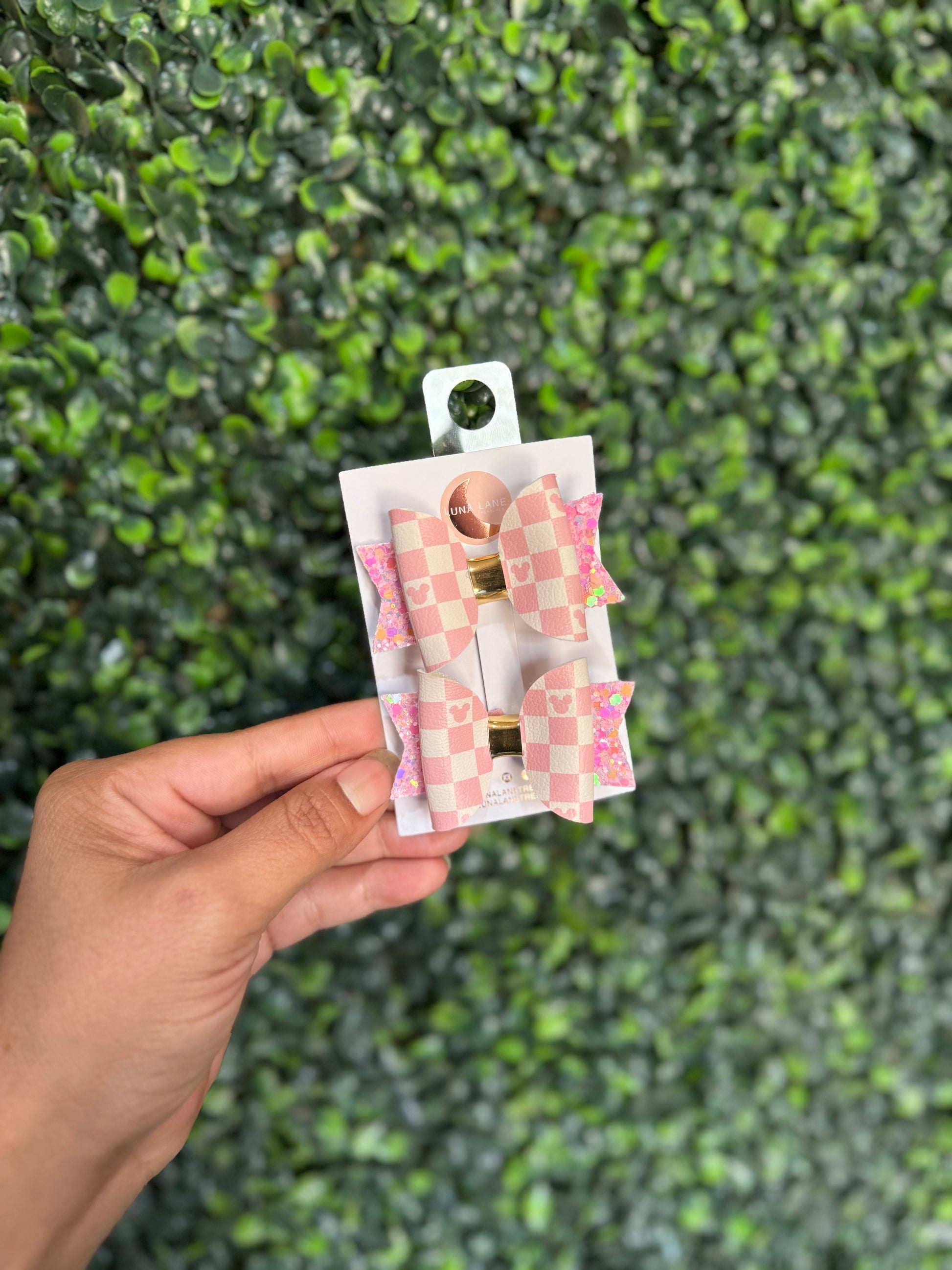 Bring on the cuteness with this Pink Checkered Ears Bow a sweet and playful addition to any outfit! The soft faux leather top layer features a blush pink and cream checkered print with subtle ear-shaped silhouettes for a whimsical touch. Backed with iridescent pink glitter and layered with love, this bow adds just the right amount of sparkle and charm.