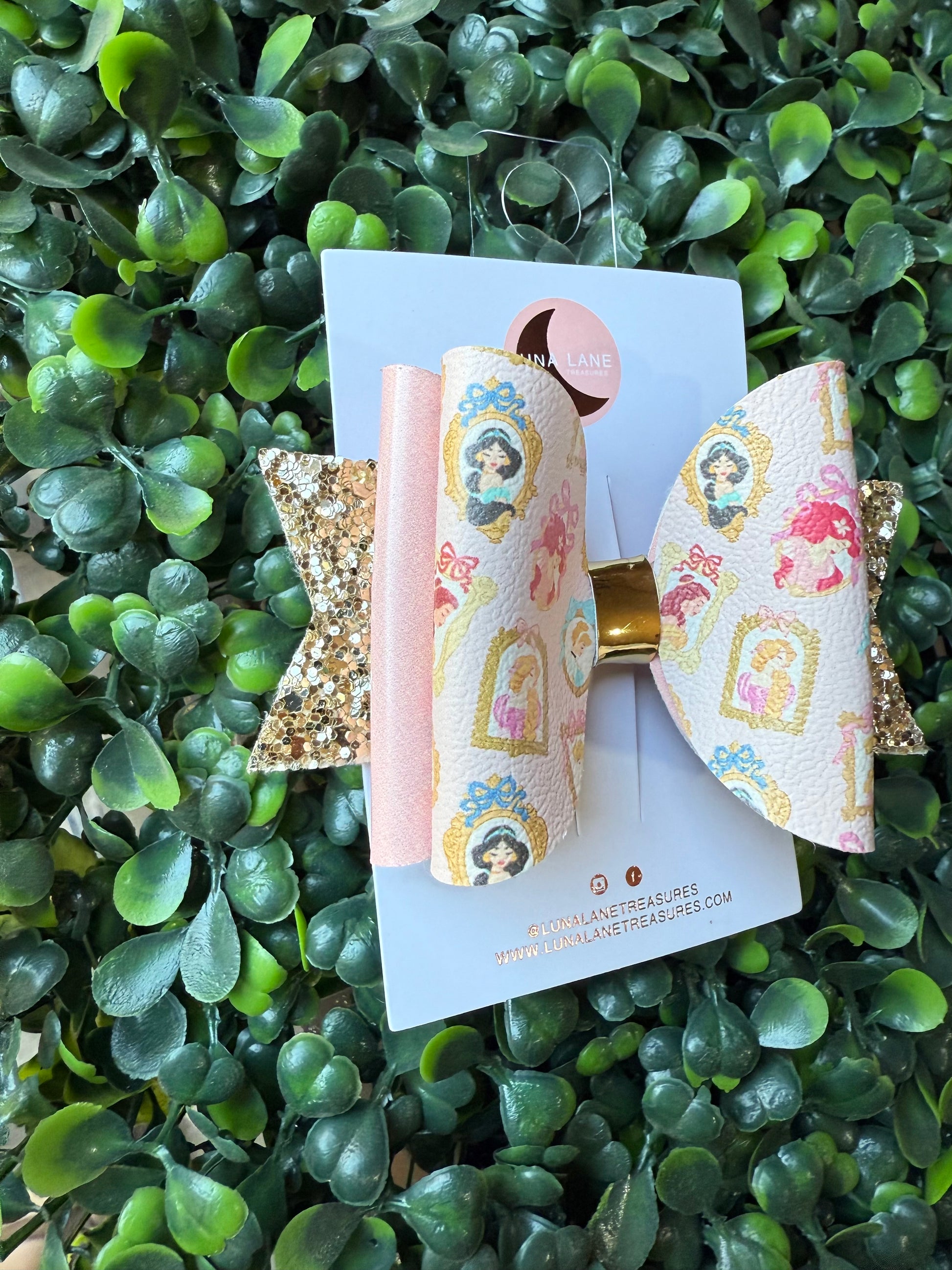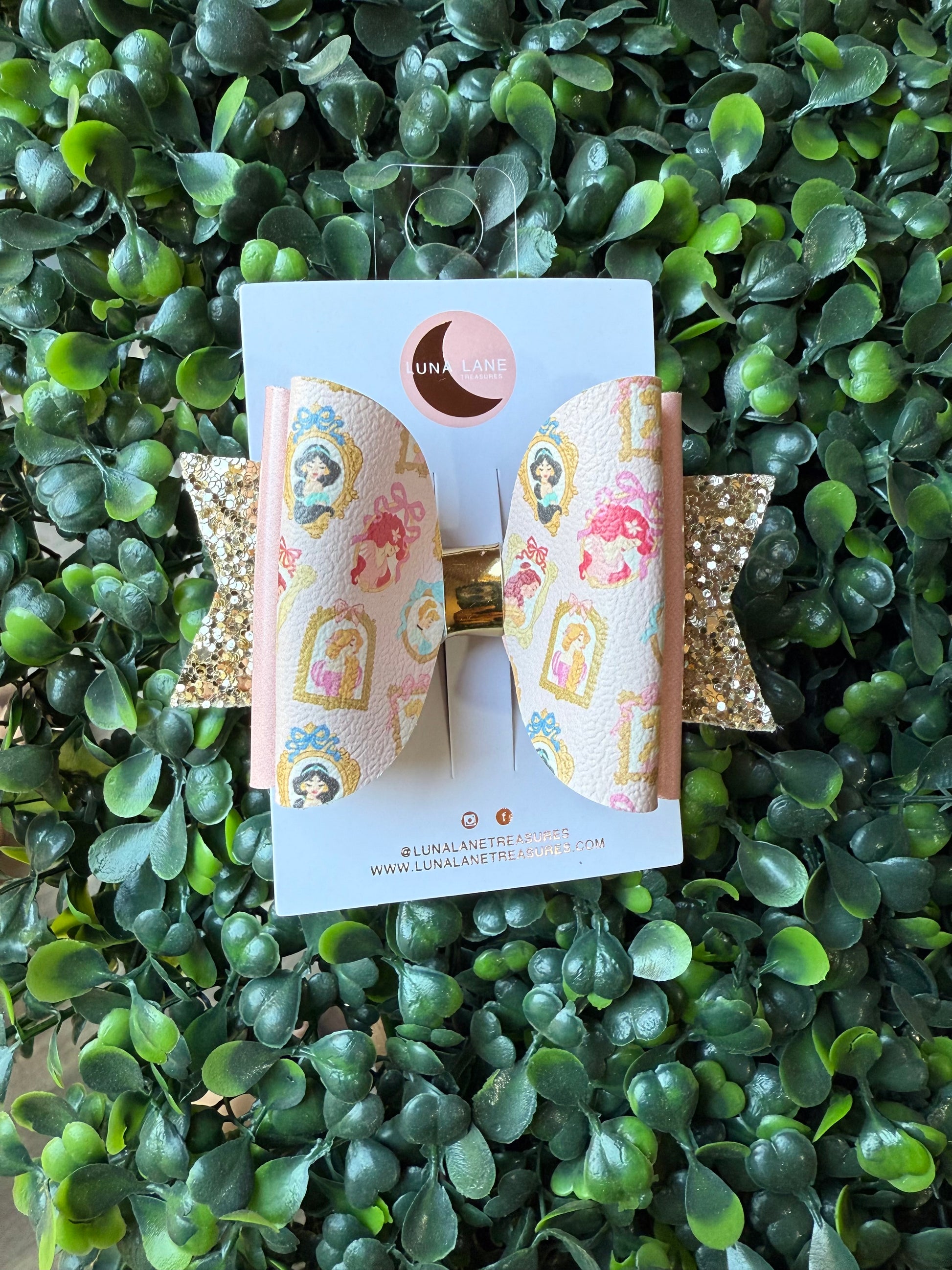 Add a royal touch to any outfit with this handmade Princess Portrait Glitter Bow! Featuring beautifully detailed frames of beloved princesses on soft faux leather this bow celebrates fairytales, castles, and happily-ever-afters. A gold glitter backing and soft blush pink layers add elegance and sparkle without losing the fun.