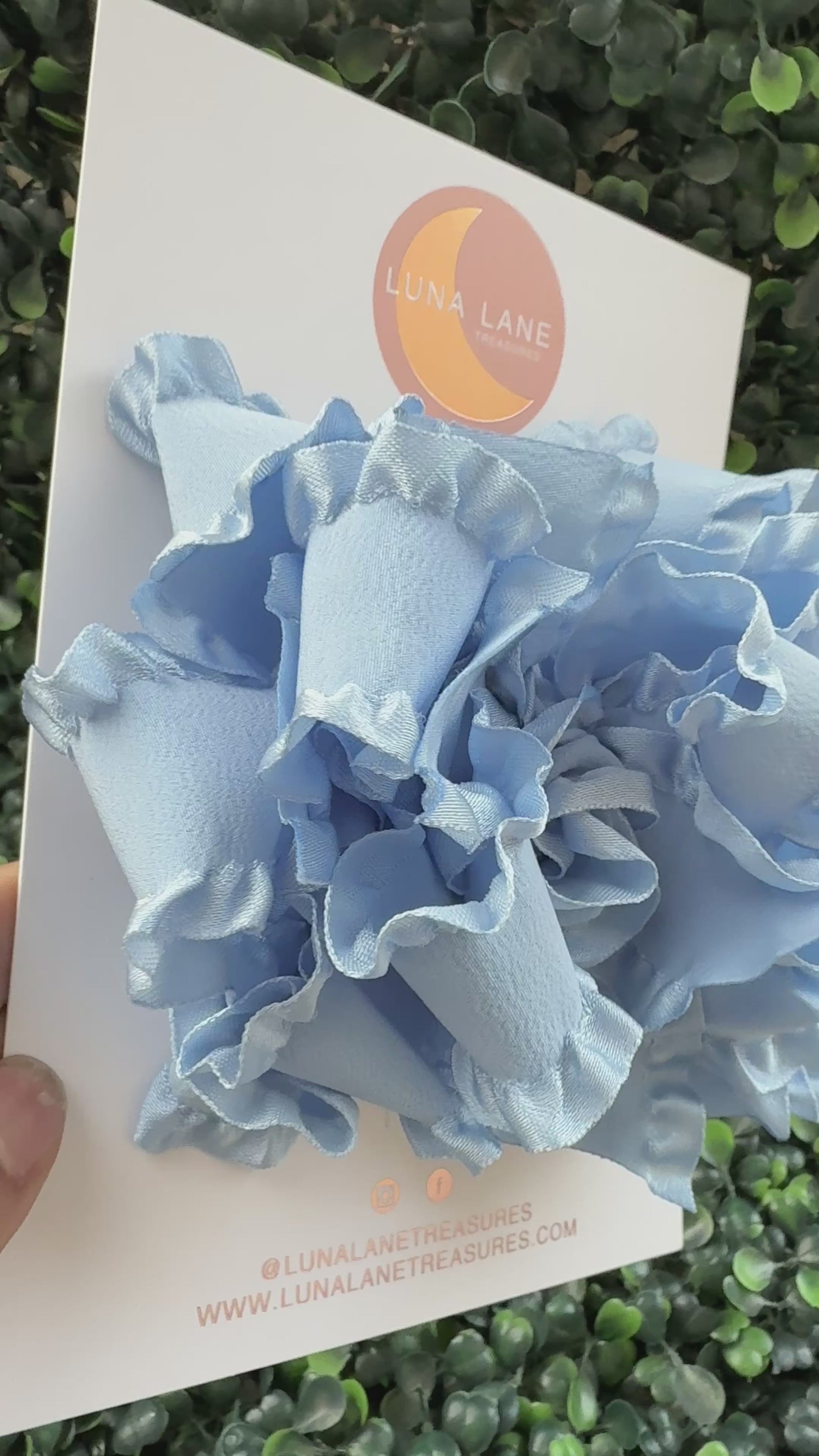 This Ruffle Bow is approximately 5.5 inches wide, featuring double layers of ruffle ribbon. It is available with an alligator clip or nylon headband attachment for alignment and stability.